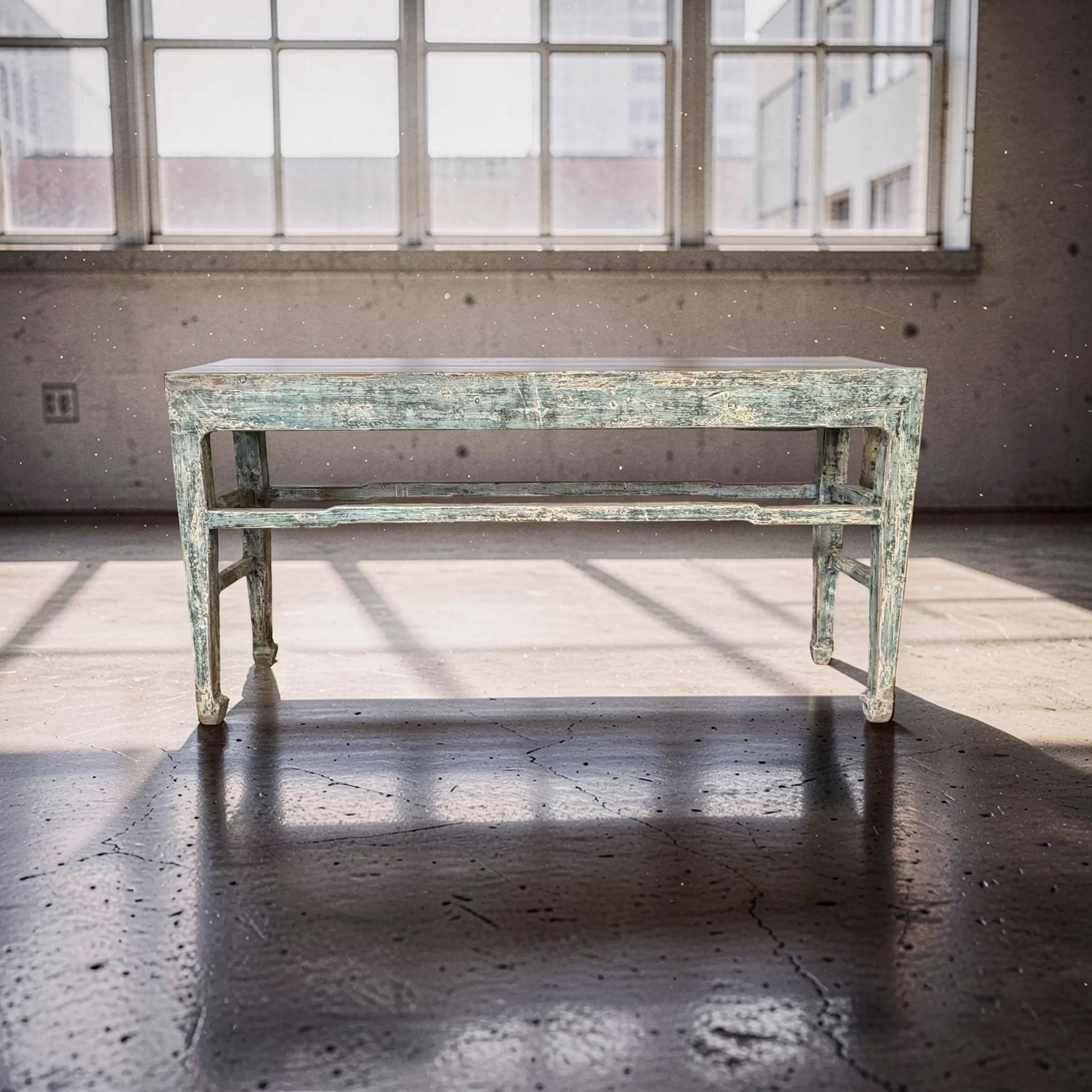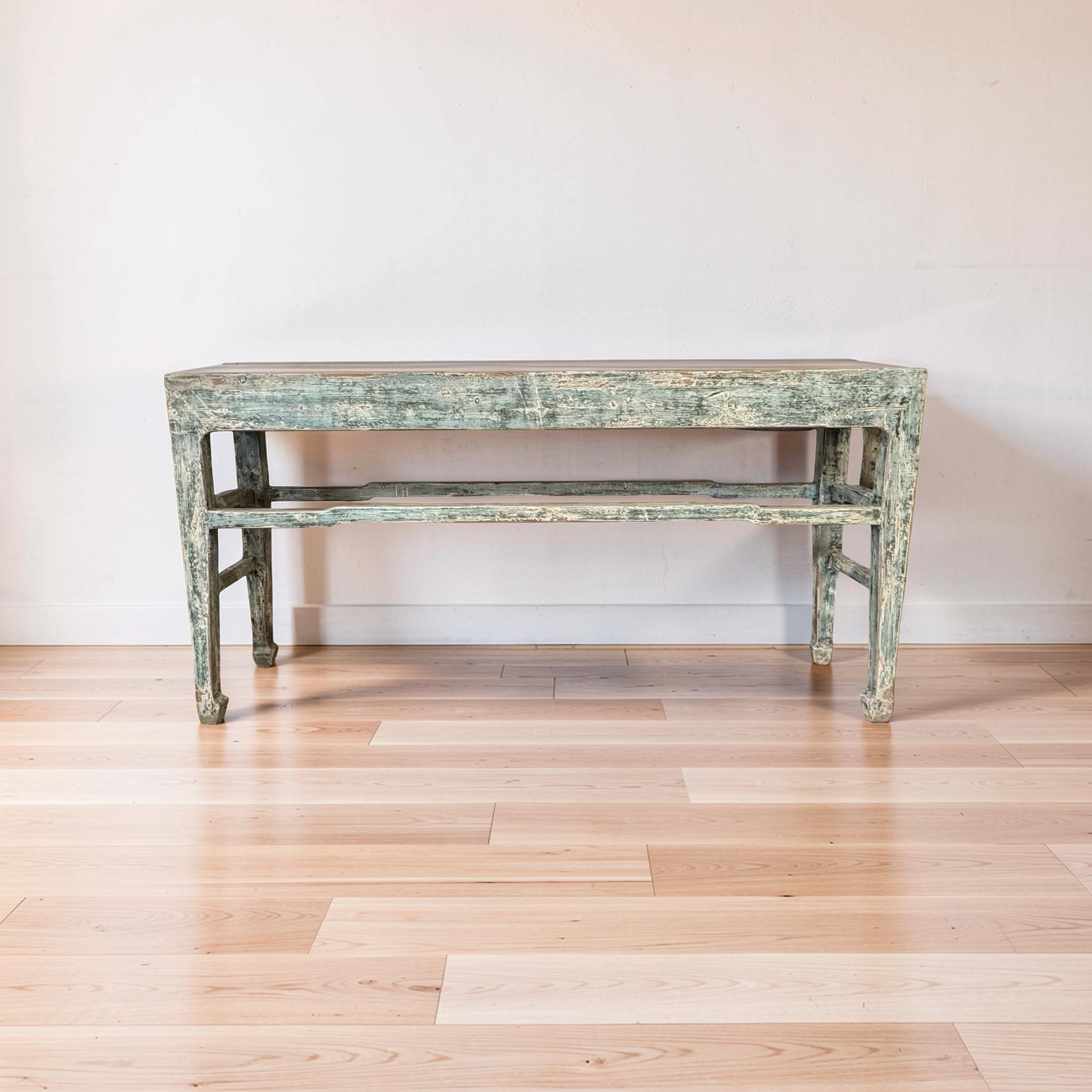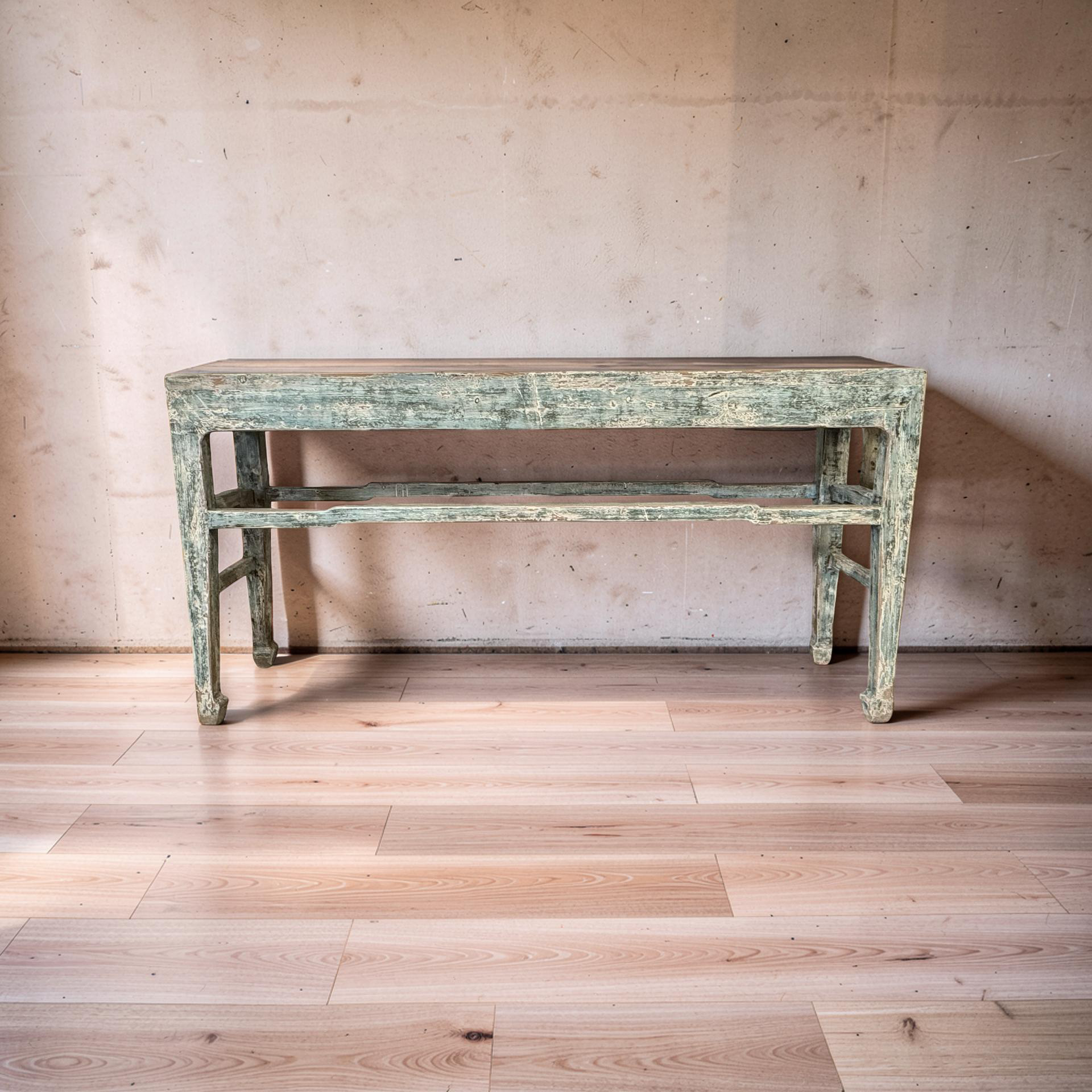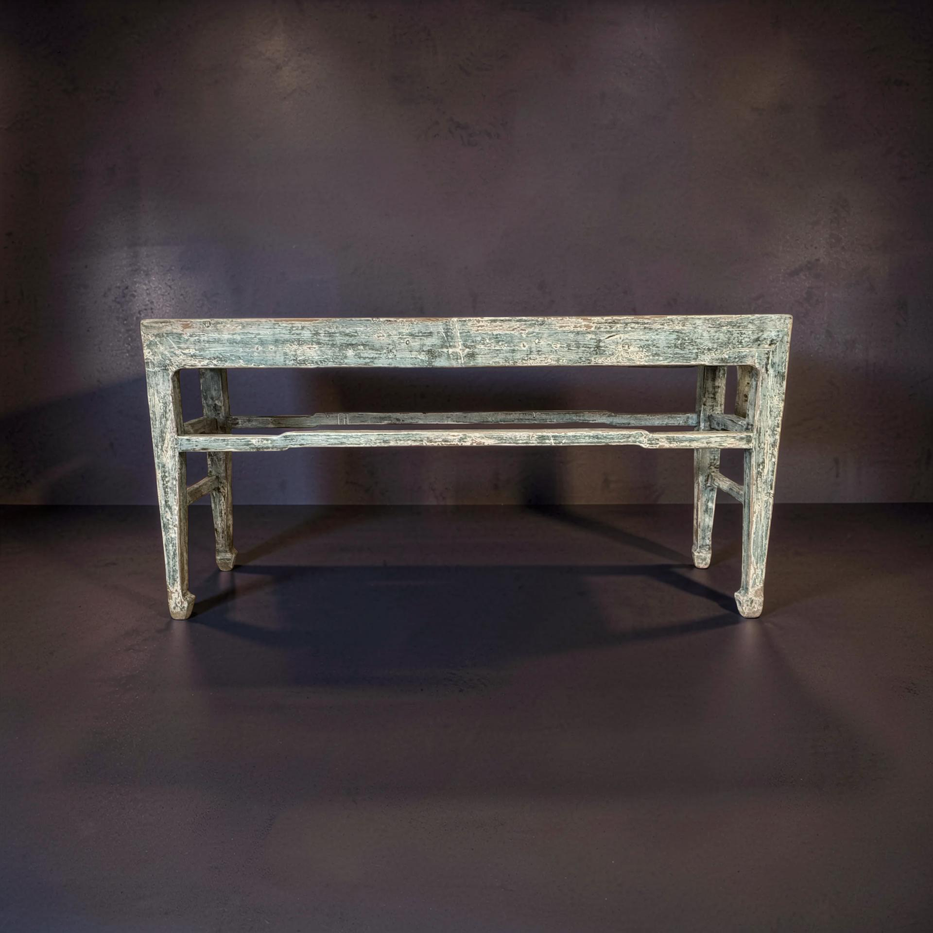 Deze grote wandtafel uit China is handgemaakt en uitgevoerd in een verfijnde grijs blauw . Het meubel heeft een rustige, evenwichtige uitstraling waarbij het ambacht duidelijk zichtbaar is in de subtiele nuances van kleur en afwerking.