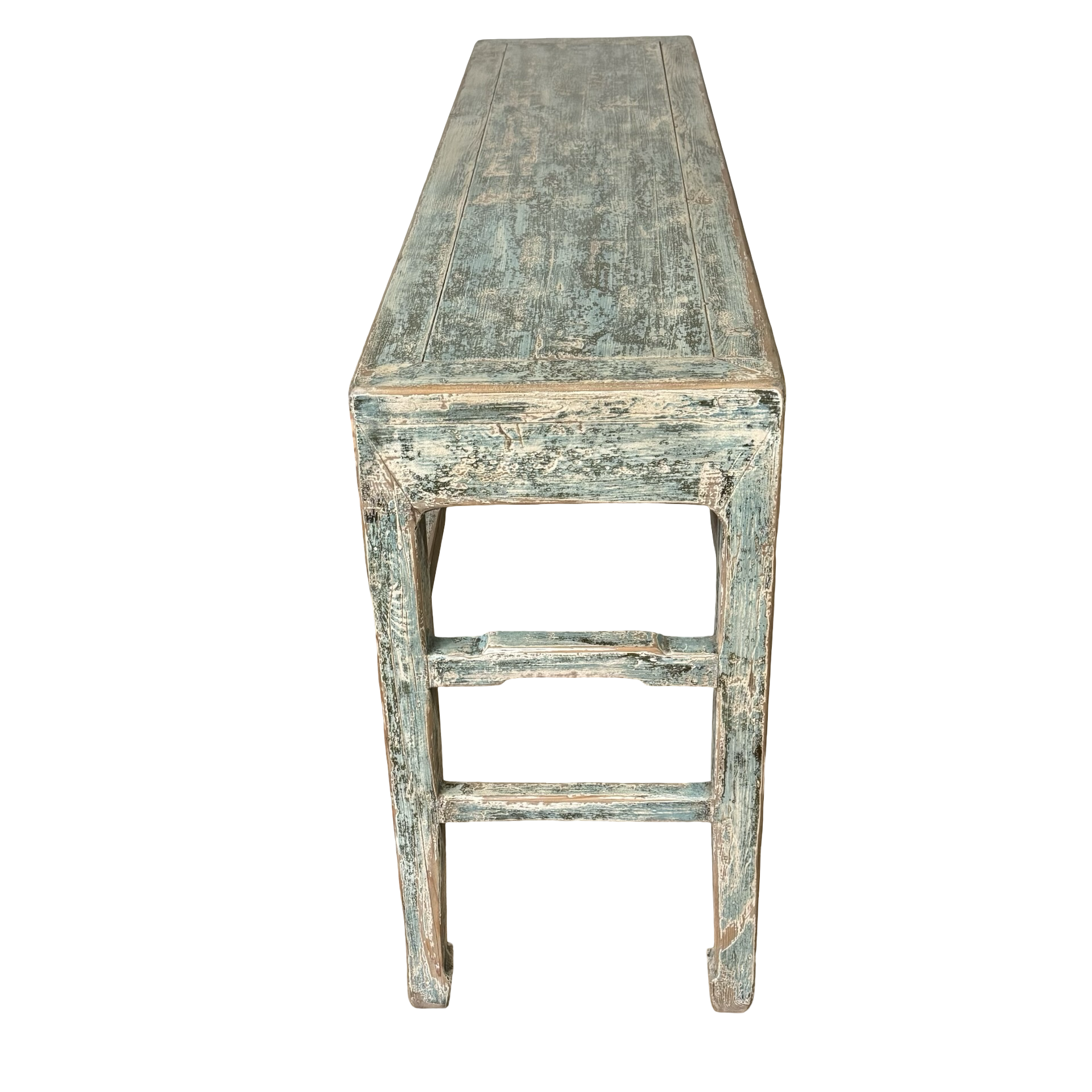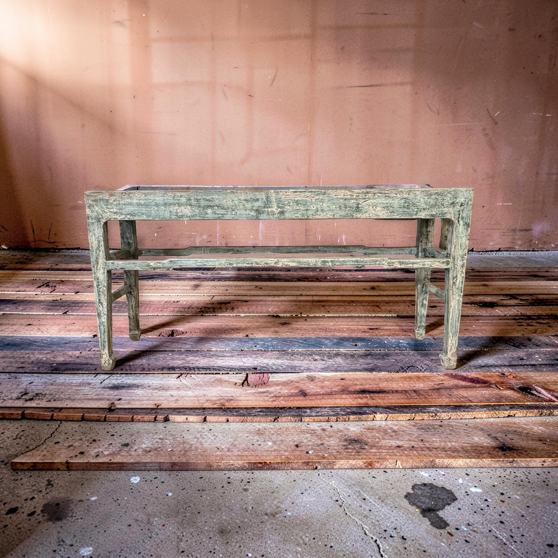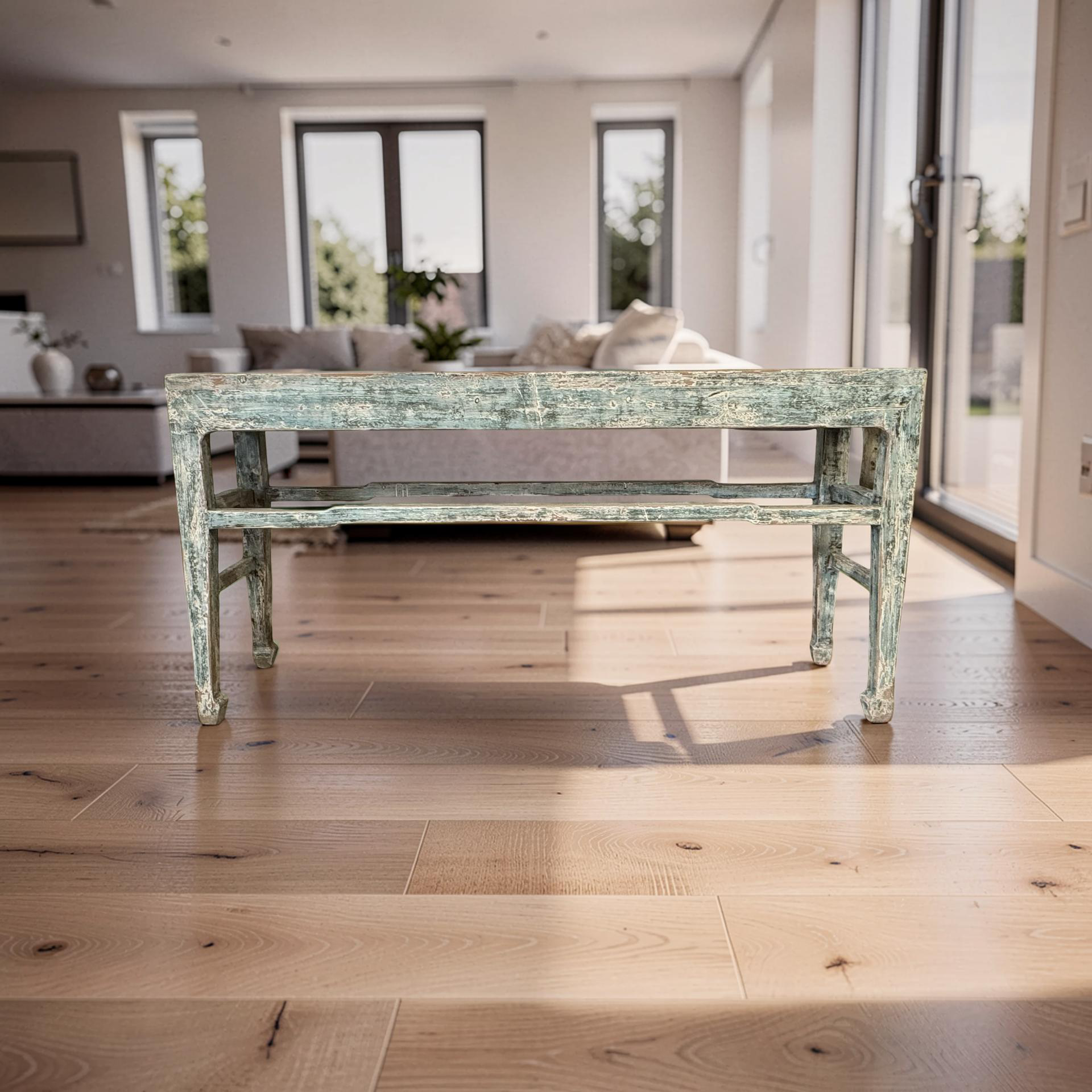 Deze grote wandtafel uit China is handgemaakt en uitgevoerd in een verfijnde grijs blauw . Het meubel heeft een rustige, evenwichtige uitstraling waarbij het ambacht duidelijk zichtbaar is in de subtiele nuances van kleur en afwerking.