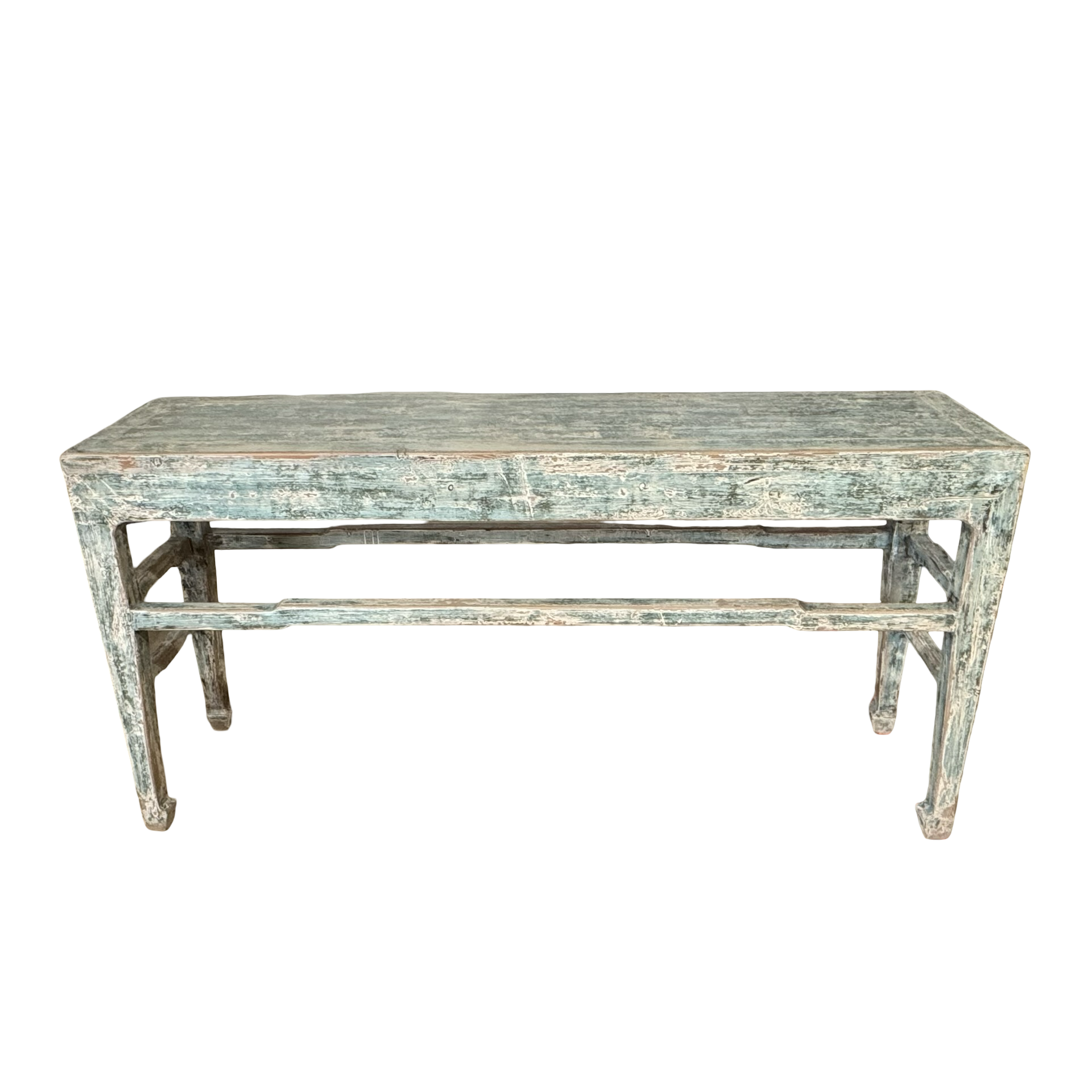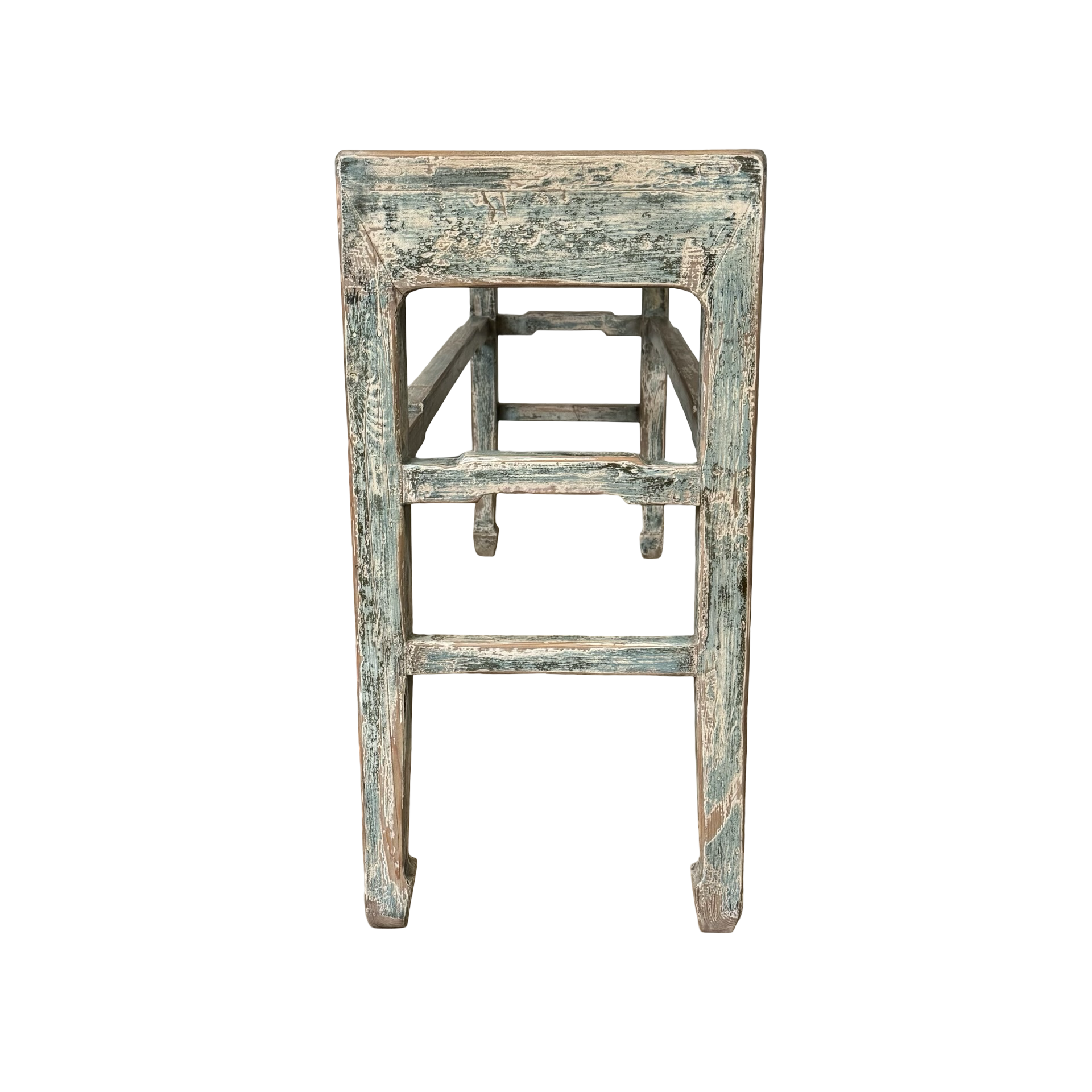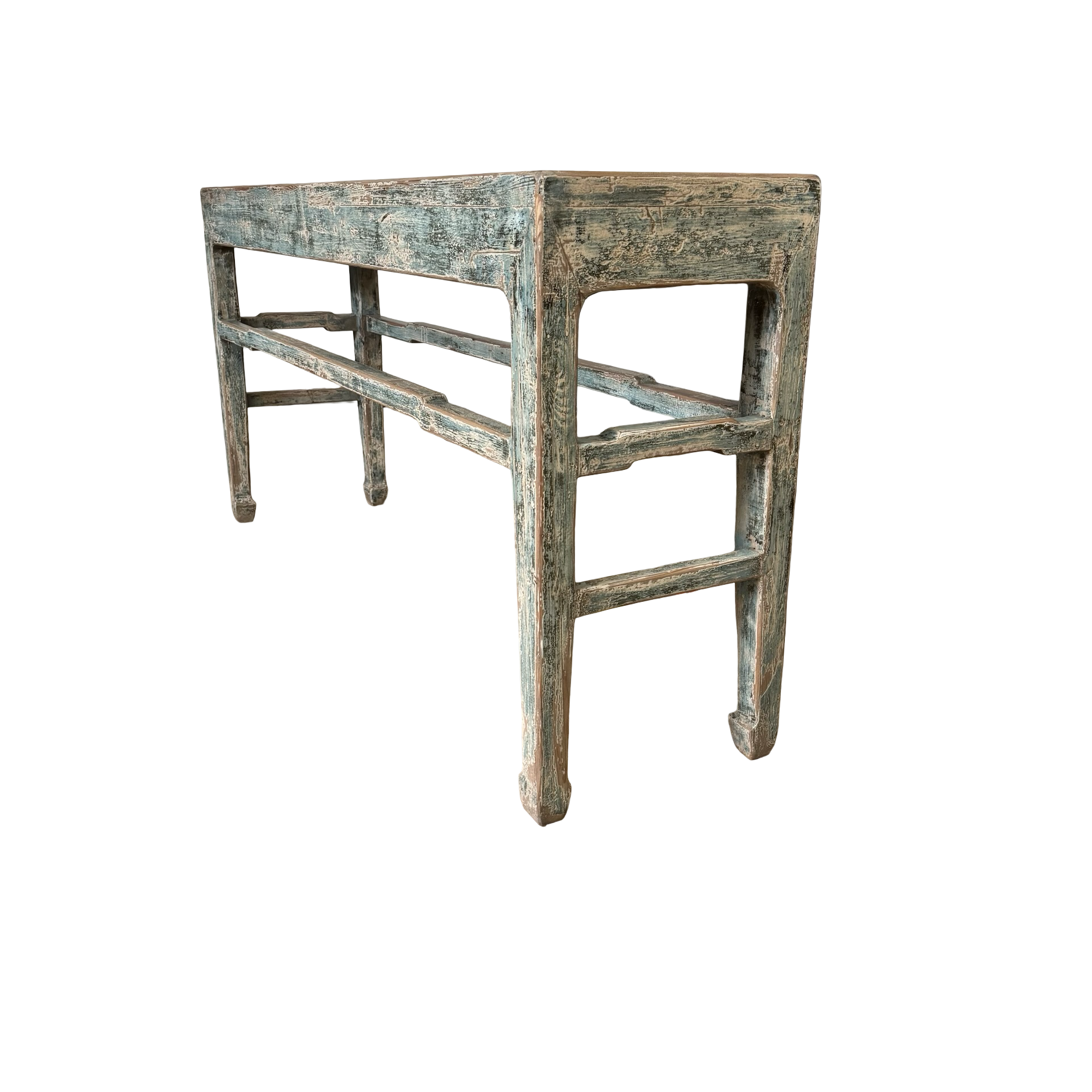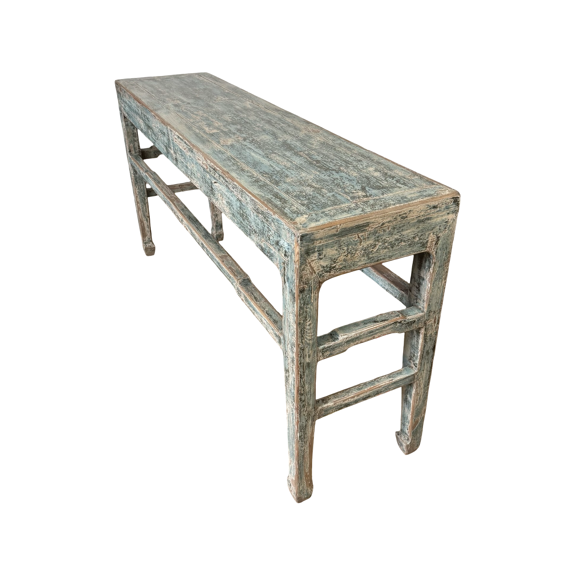 Deze grote wandtafel uit China is handgemaakt en uitgevoerd in een verfijnde grijs blauw . Het meubel heeft een rustige, evenwichtige uitstraling waarbij het ambacht duidelijk zichtbaar is in de subtiele nuances van kleur en afwerking.