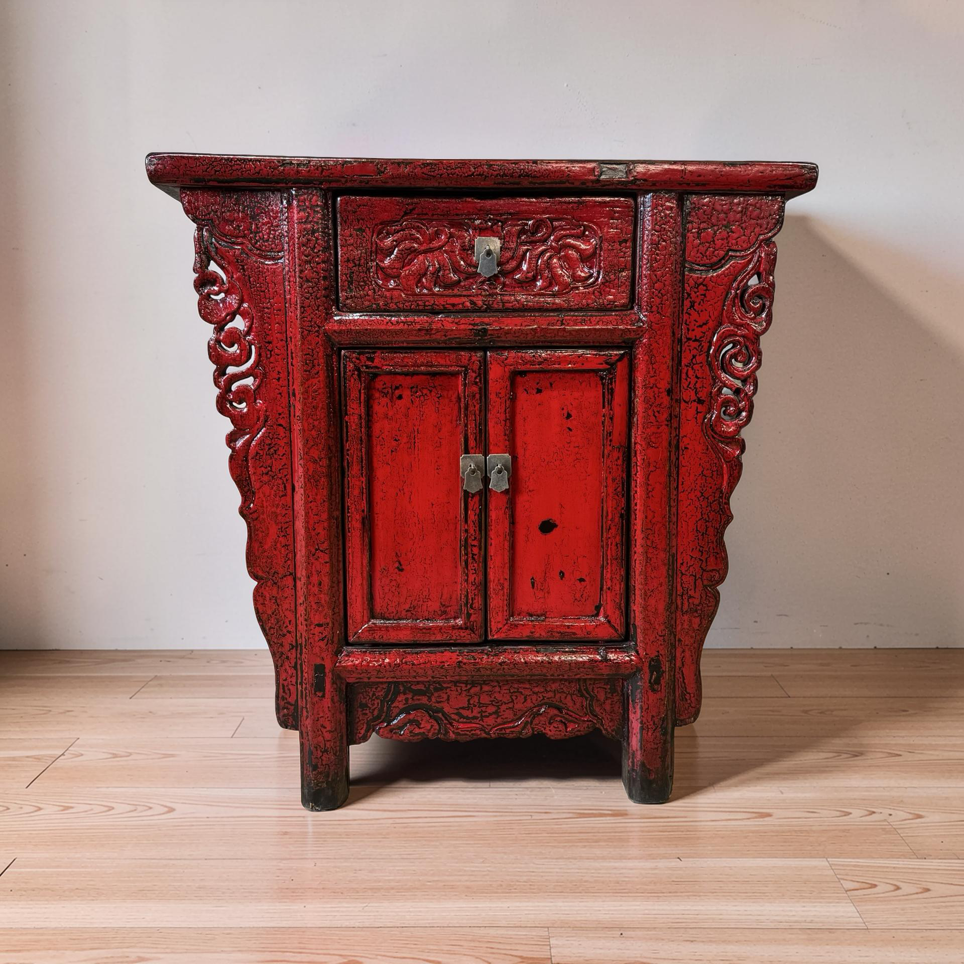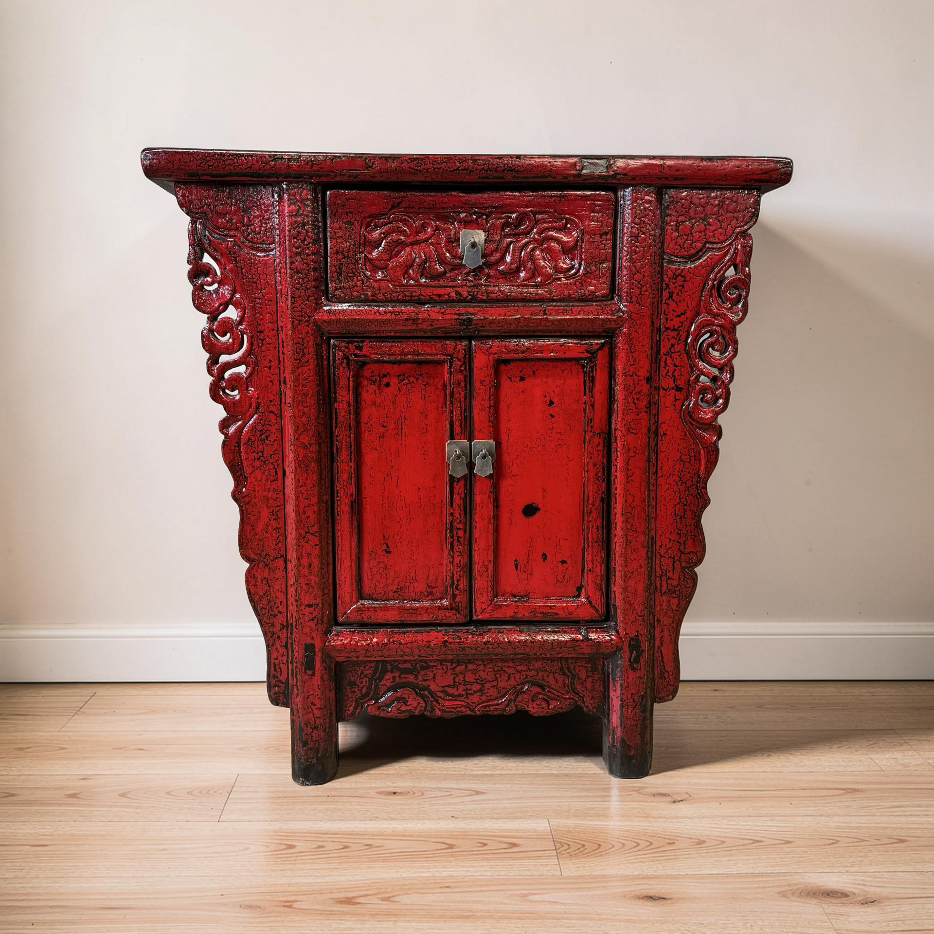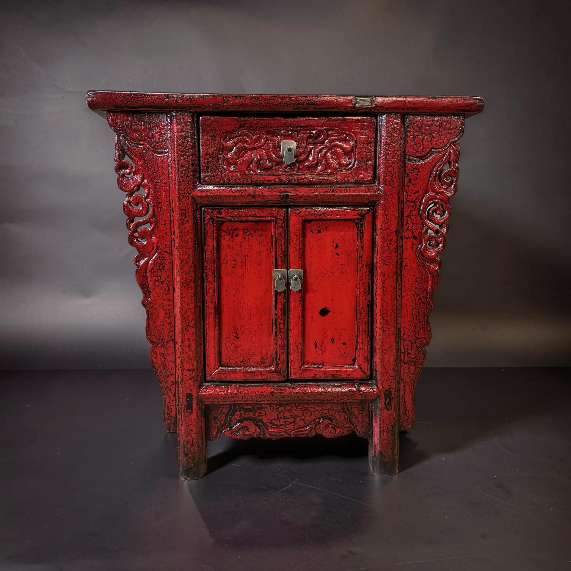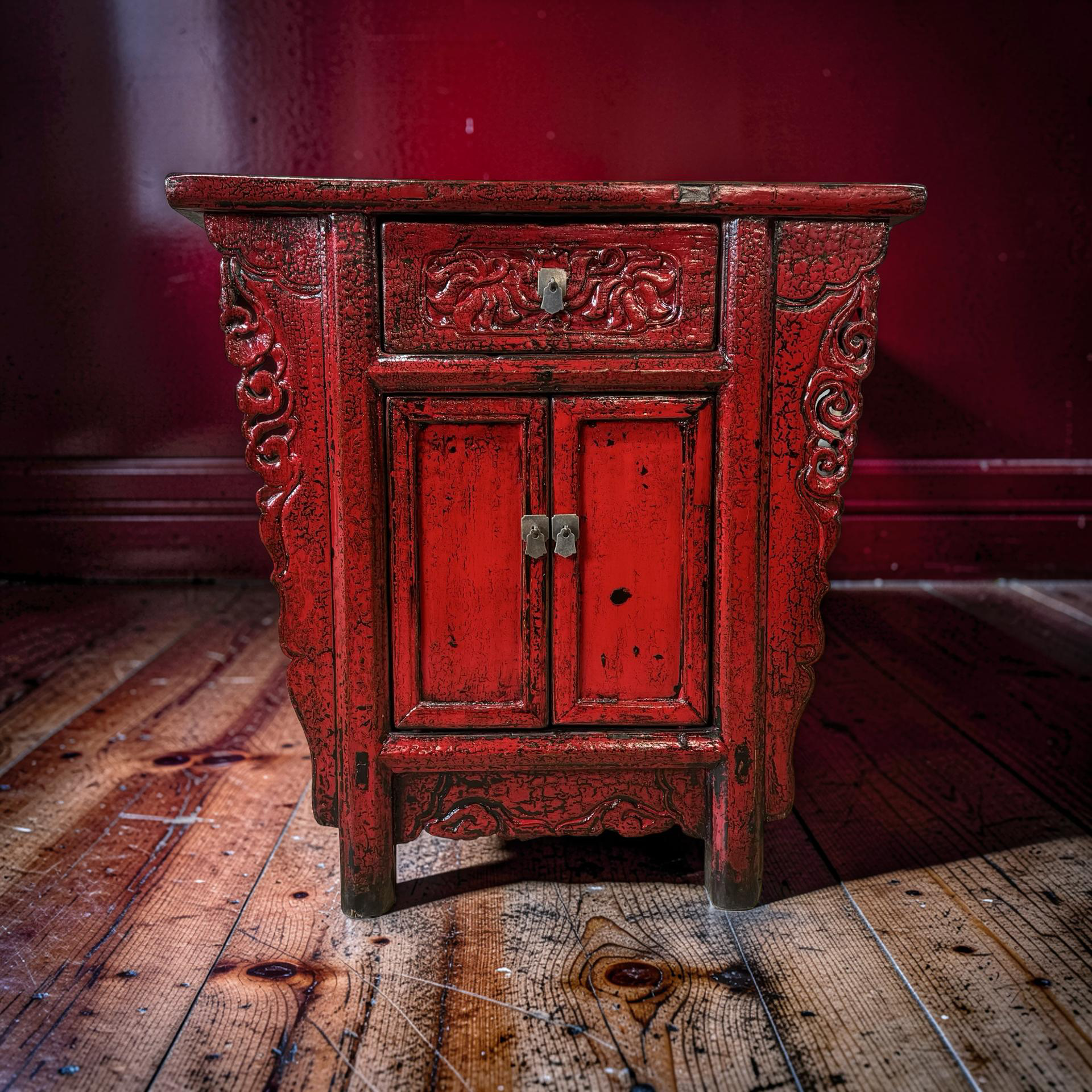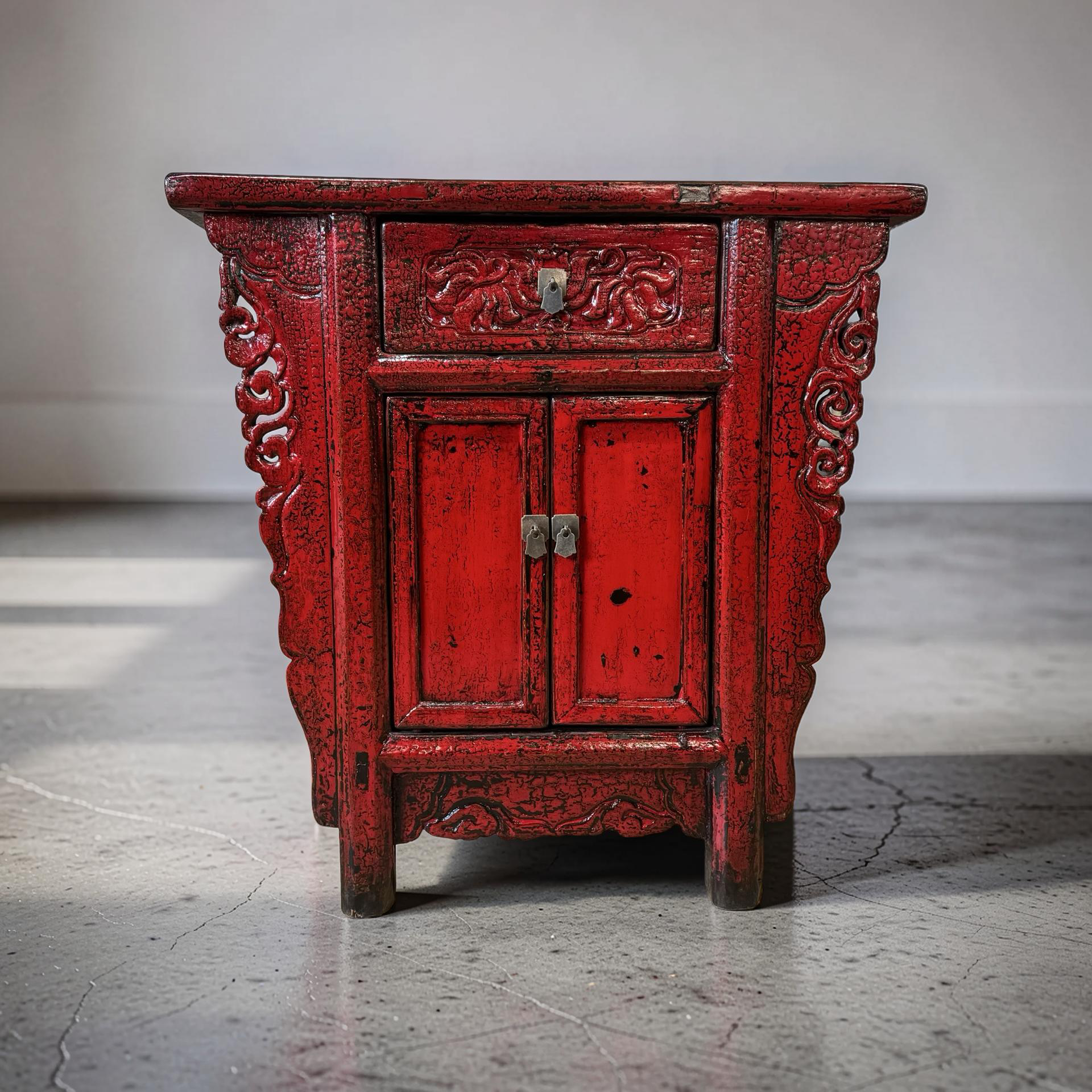 Deze unieke wandtafel uit de Shanxi-regio in China is een handgemaakt stuk met een warme, rode lakafwerking. Het meubel combineert twee deurtjes en een lade, waardoor functionaliteit en traditionele vormgeving samenkomen in een compact ontwerp.