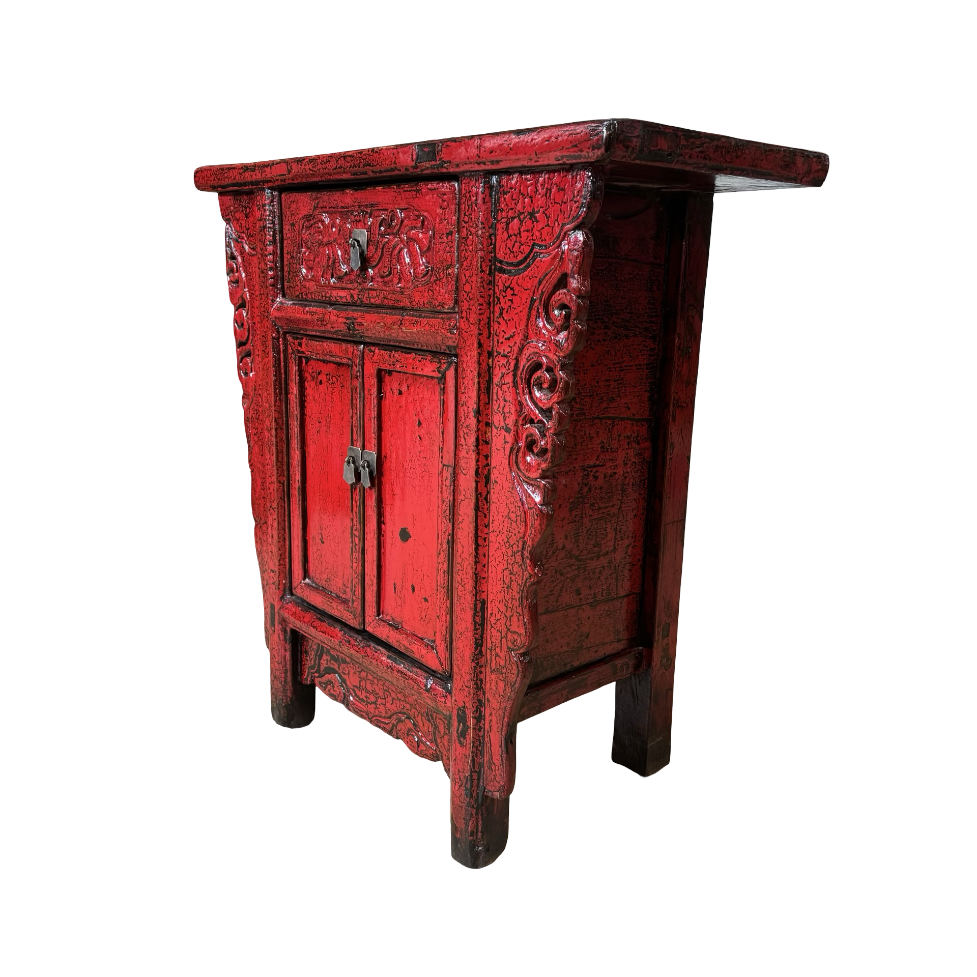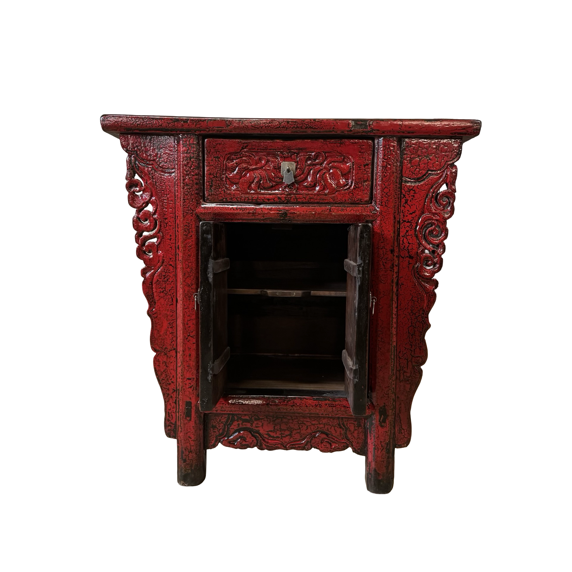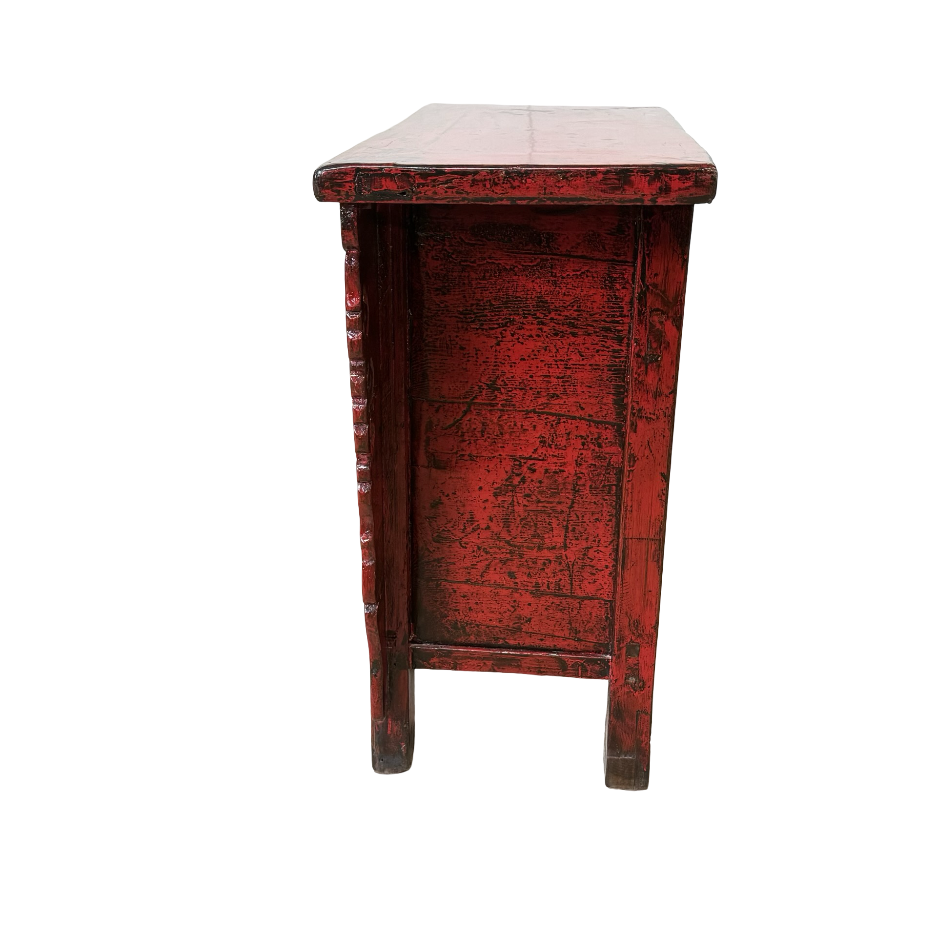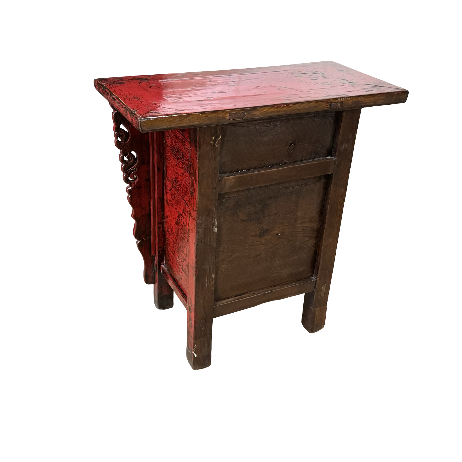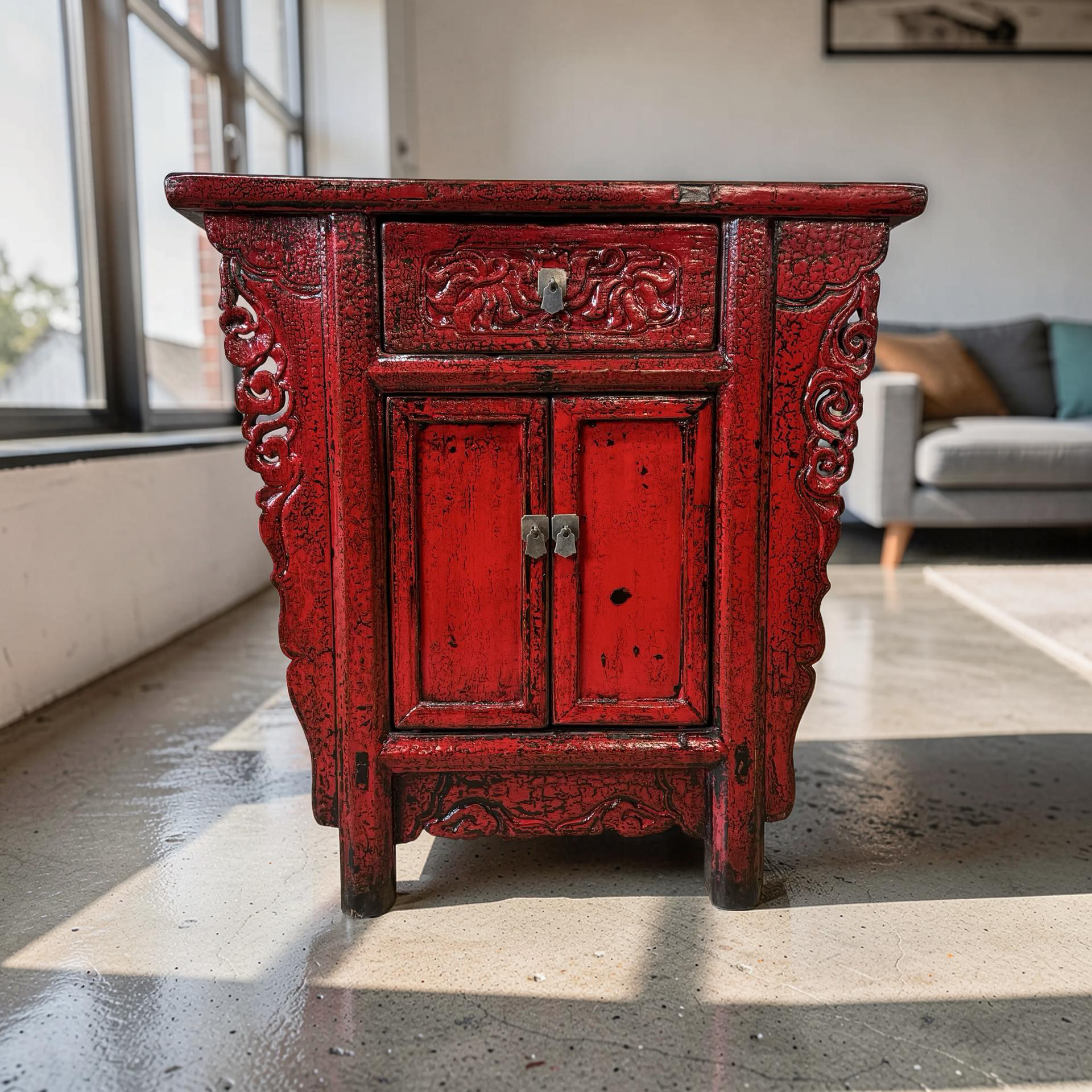 Deze unieke wandtafel uit de Shanxi-regio in China is een handgemaakt stuk met een warme, rode lakafwerking. Het meubel combineert twee deurtjes en een lade, waardoor functionaliteit en traditionele vormgeving samenkomen in een compact ontwerp.
