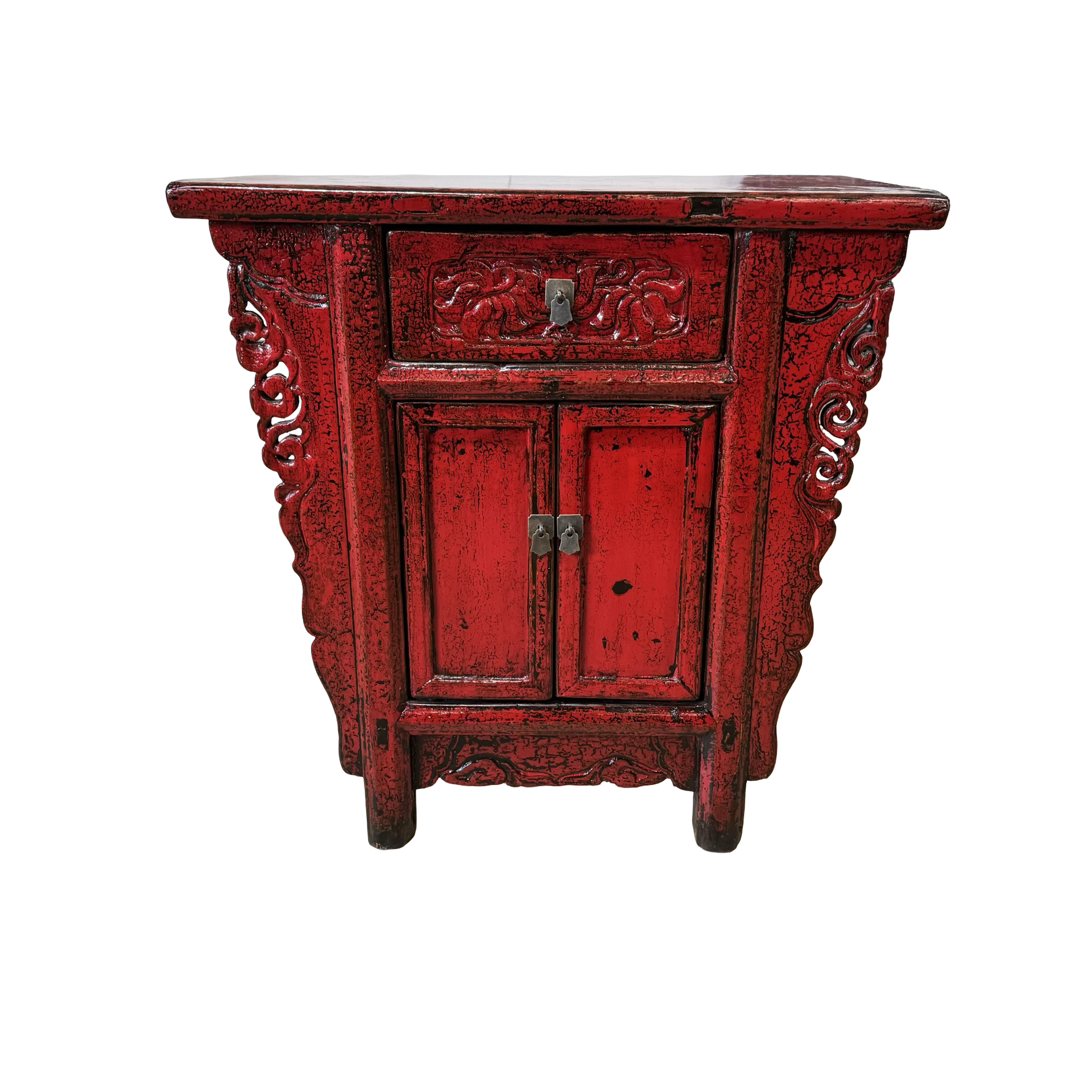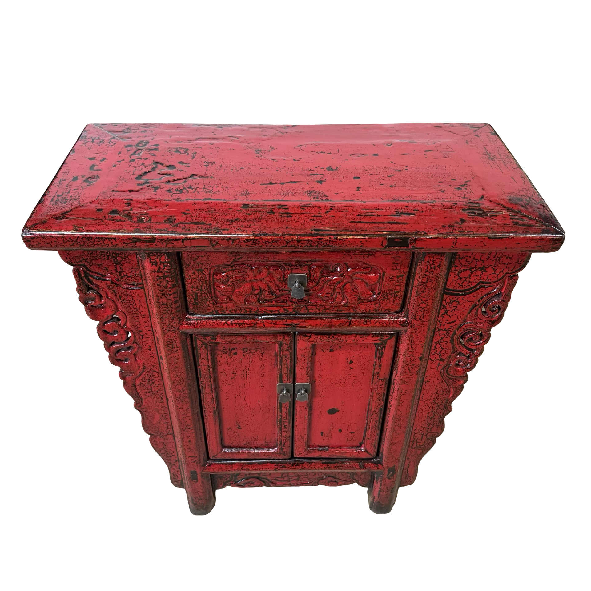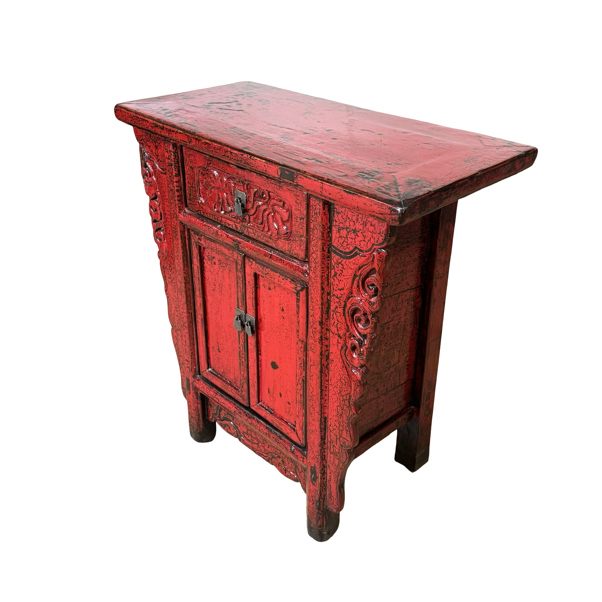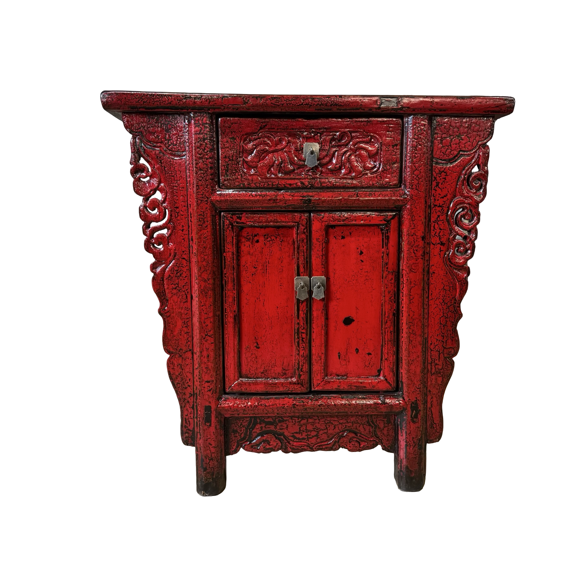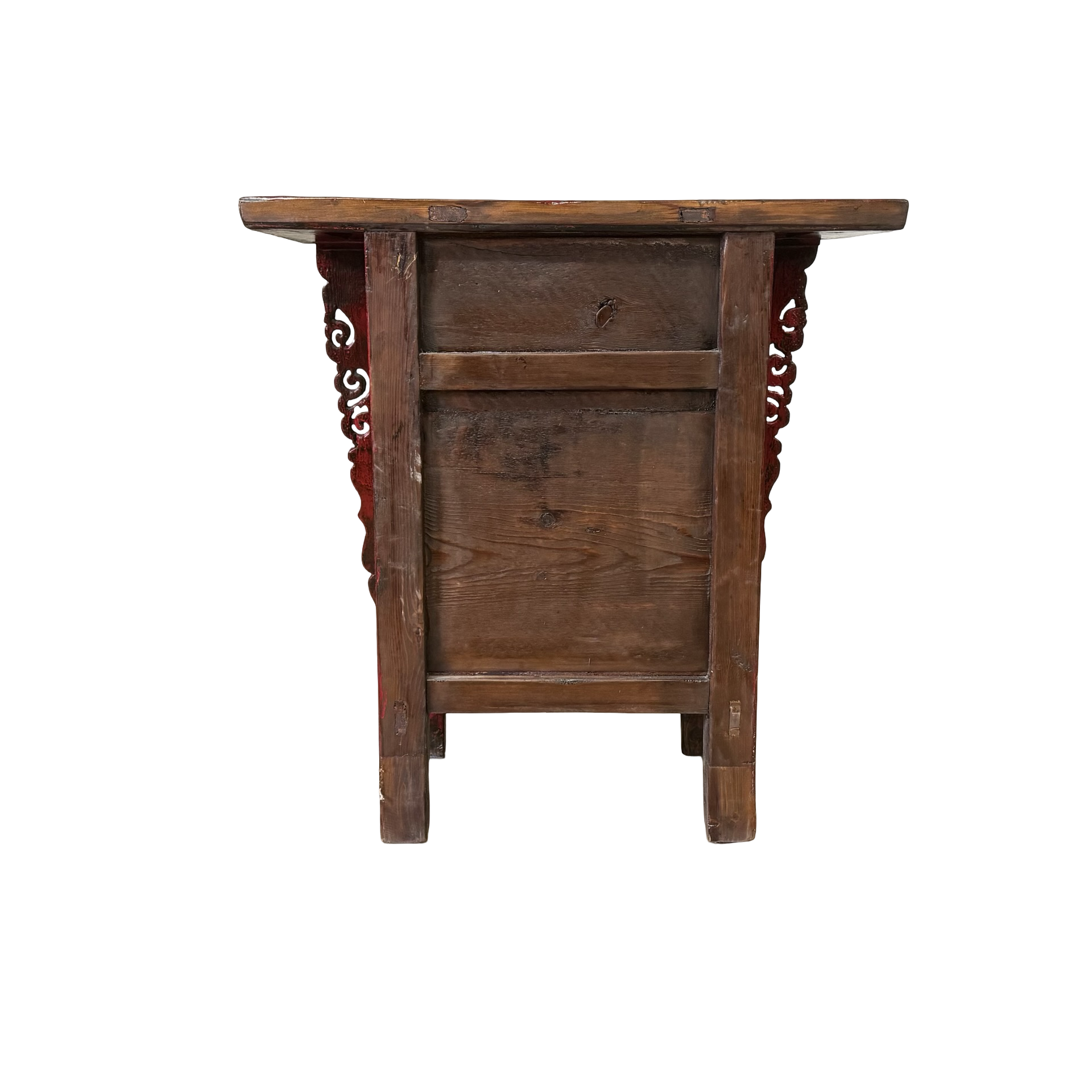 Deze unieke wandtafel uit de Shanxi-regio in China is een handgemaakt stuk met een warme, rode lakafwerking. Het meubel combineert twee deurtjes en een lade, waardoor functionaliteit en traditionele vormgeving samenkomen in een compact ontwerp.