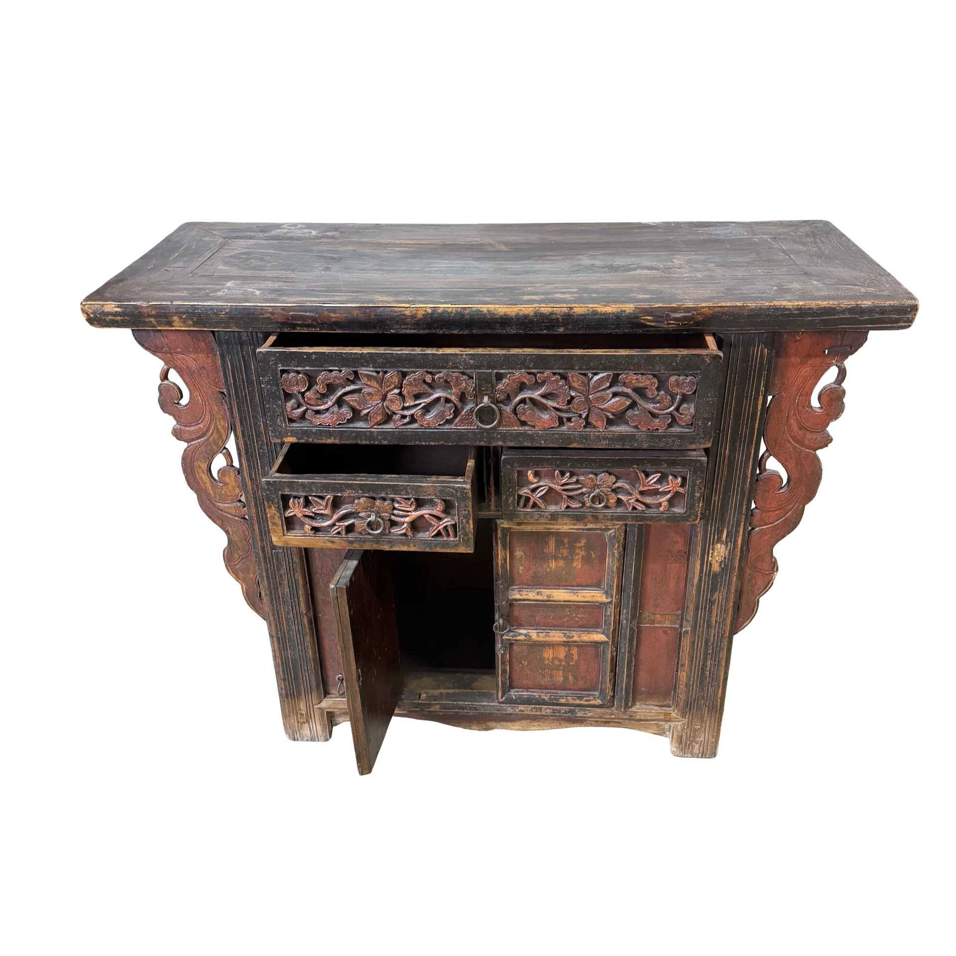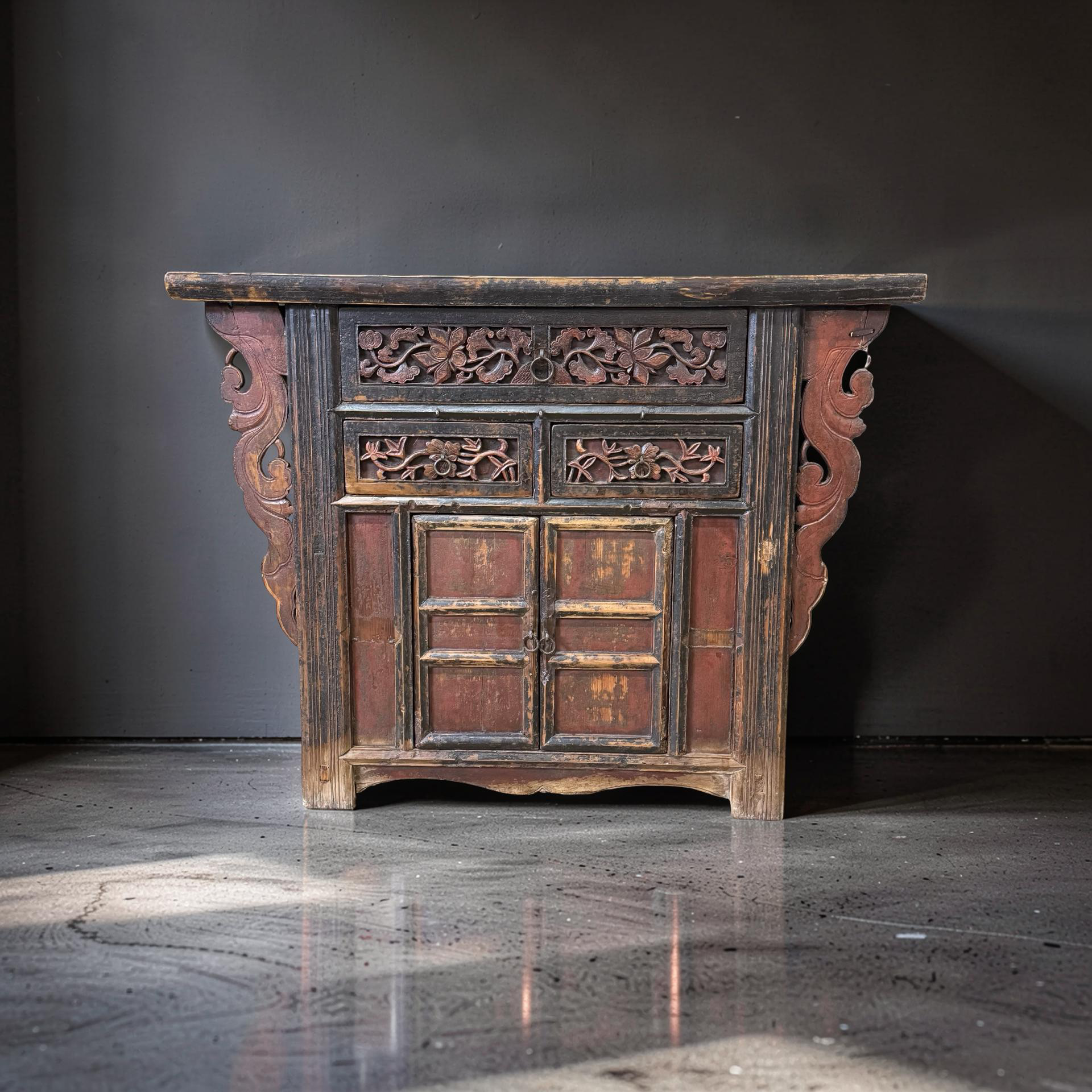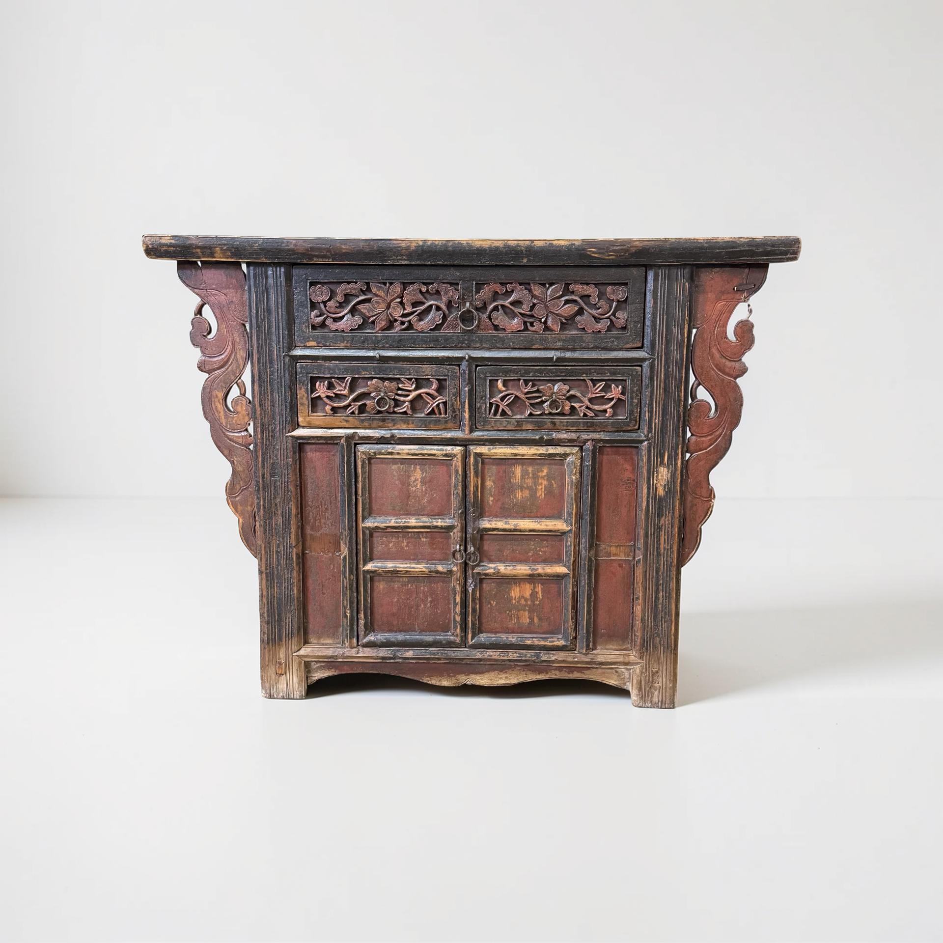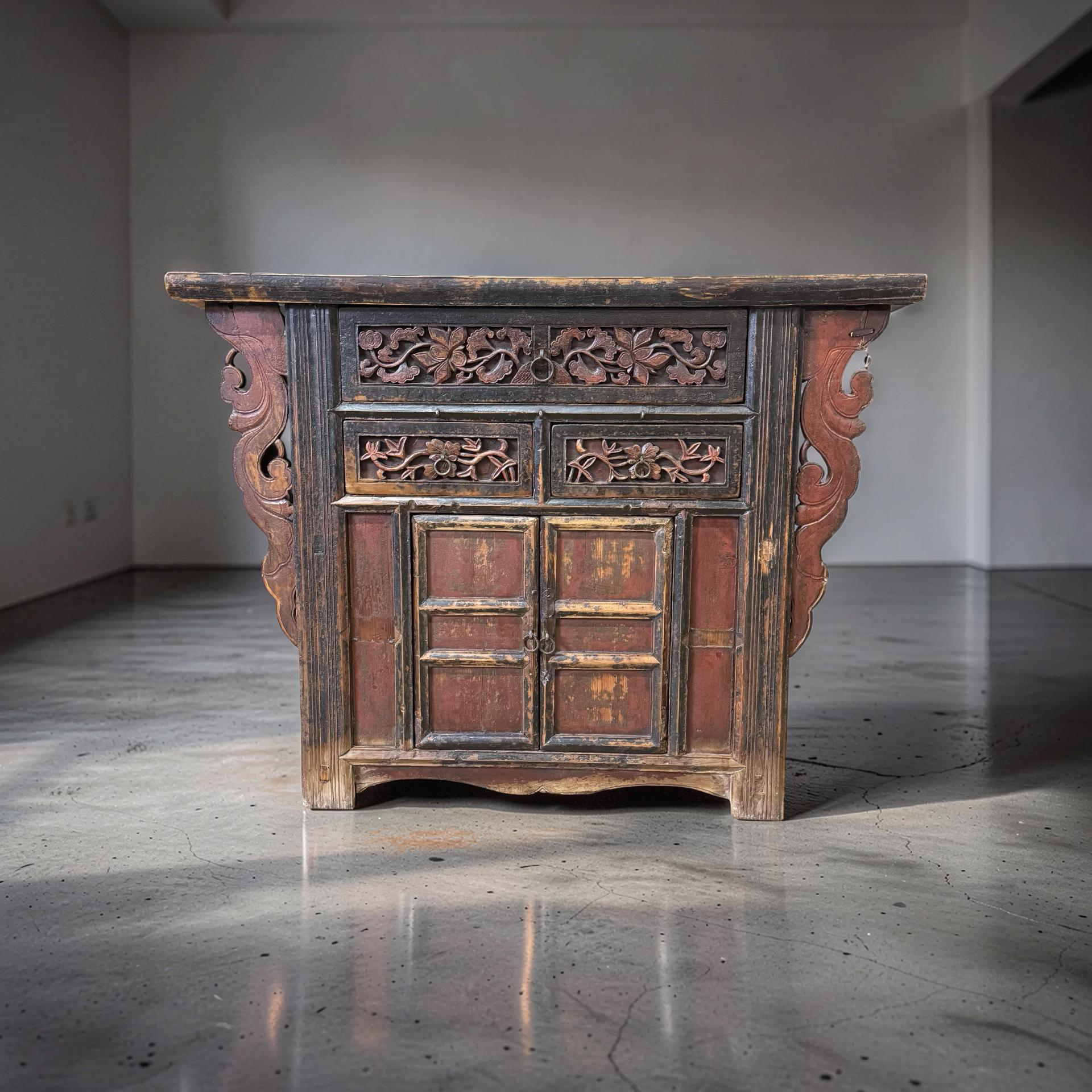 Deze unieke wandtafel uit China is rijk gedecoreerd met verfijnd handgesneden details, die het ambachtelijke karakter direct zichtbaar maken. Het meubel is voorzien van twee deurtjes en drie lades, wat zorgt voor een praktische indeling met voldoende opbergruimte.