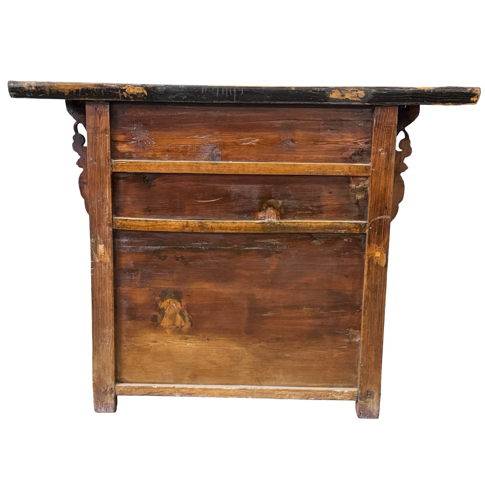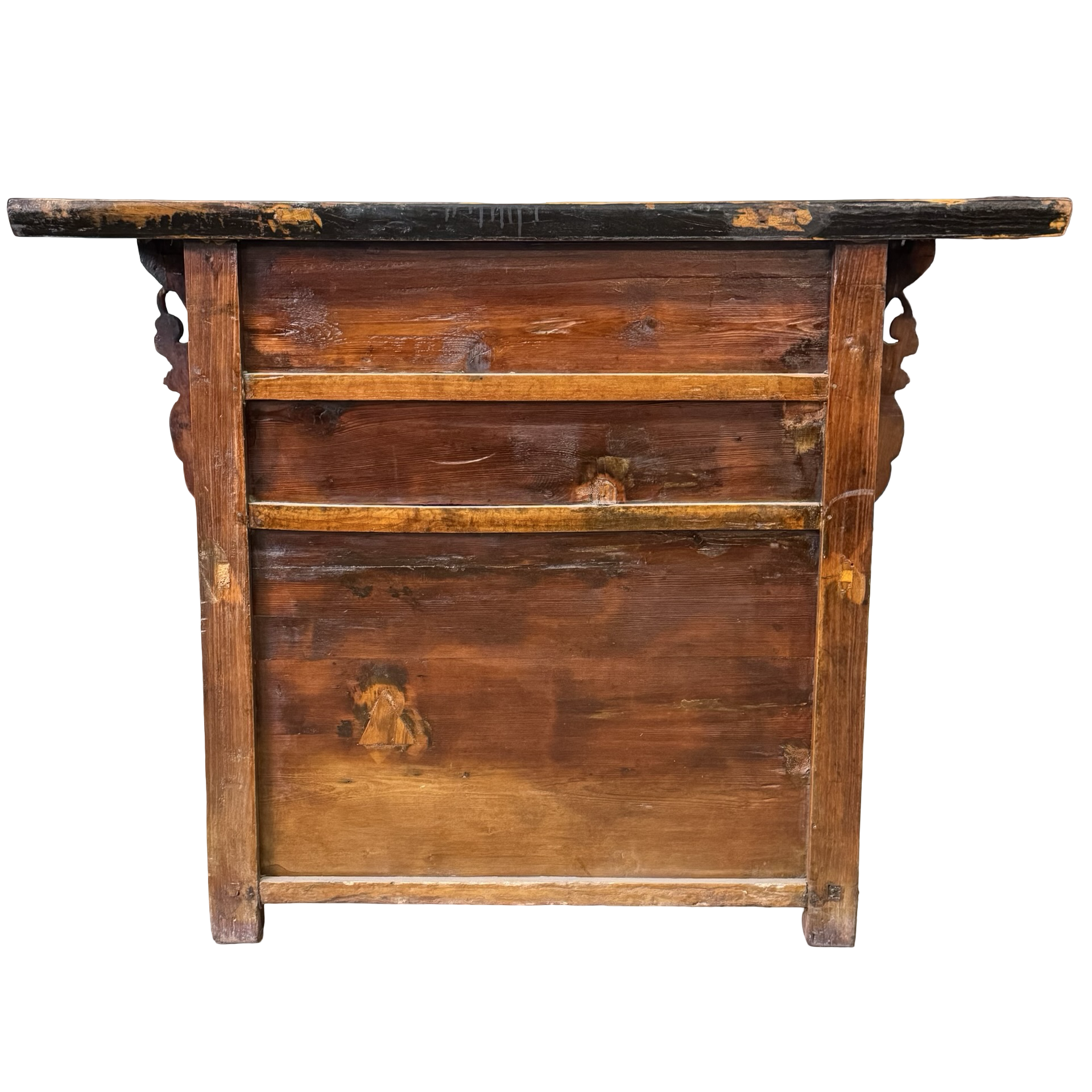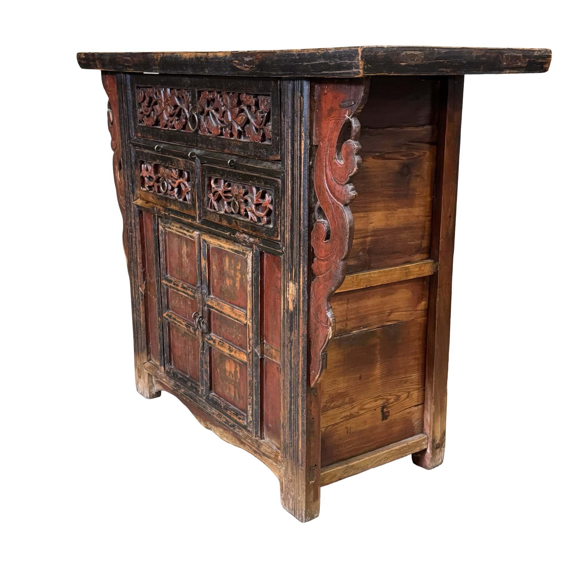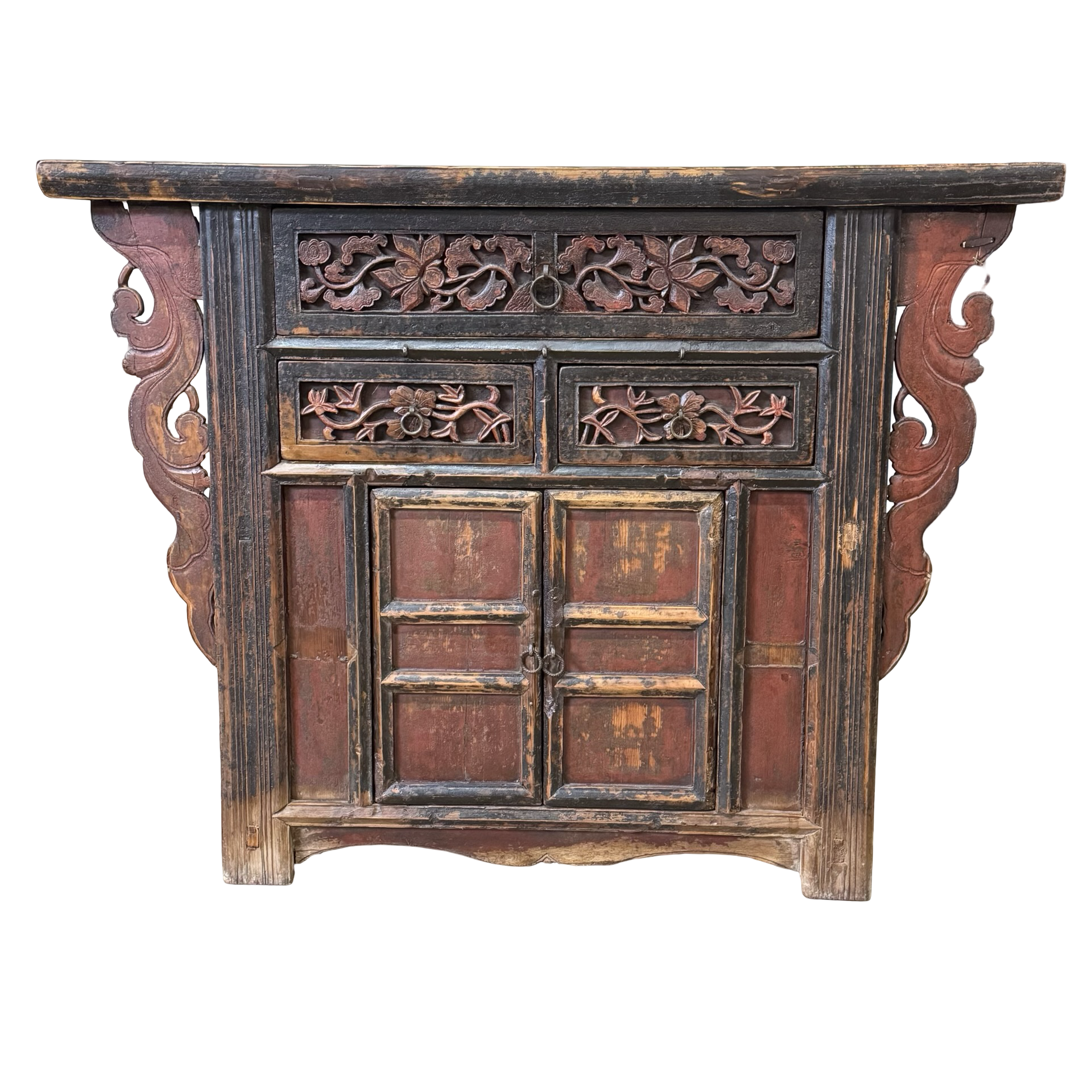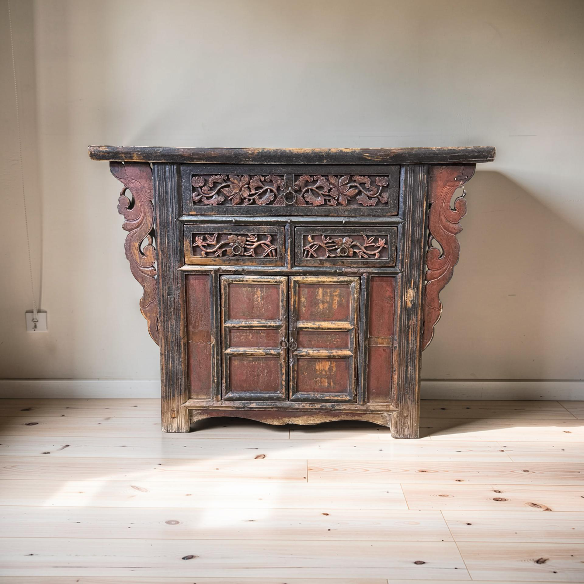 Deze unieke wandtafel uit China is rijk gedecoreerd met verfijnd handgesneden details, die het ambachtelijke karakter direct zichtbaar maken. Het meubel is voorzien van twee deurtjes en drie lades, wat zorgt voor een praktische indeling met voldoende opbergruimte.