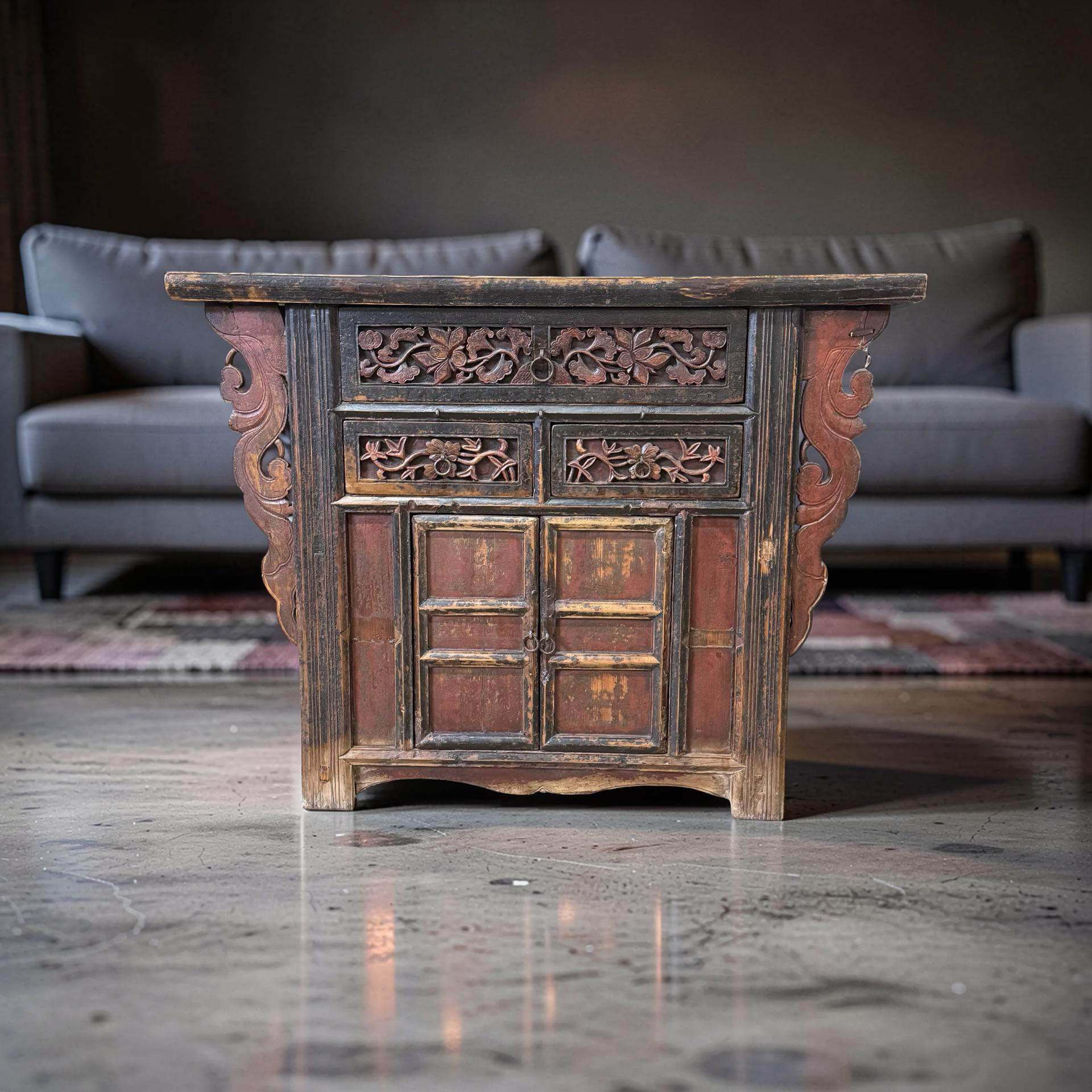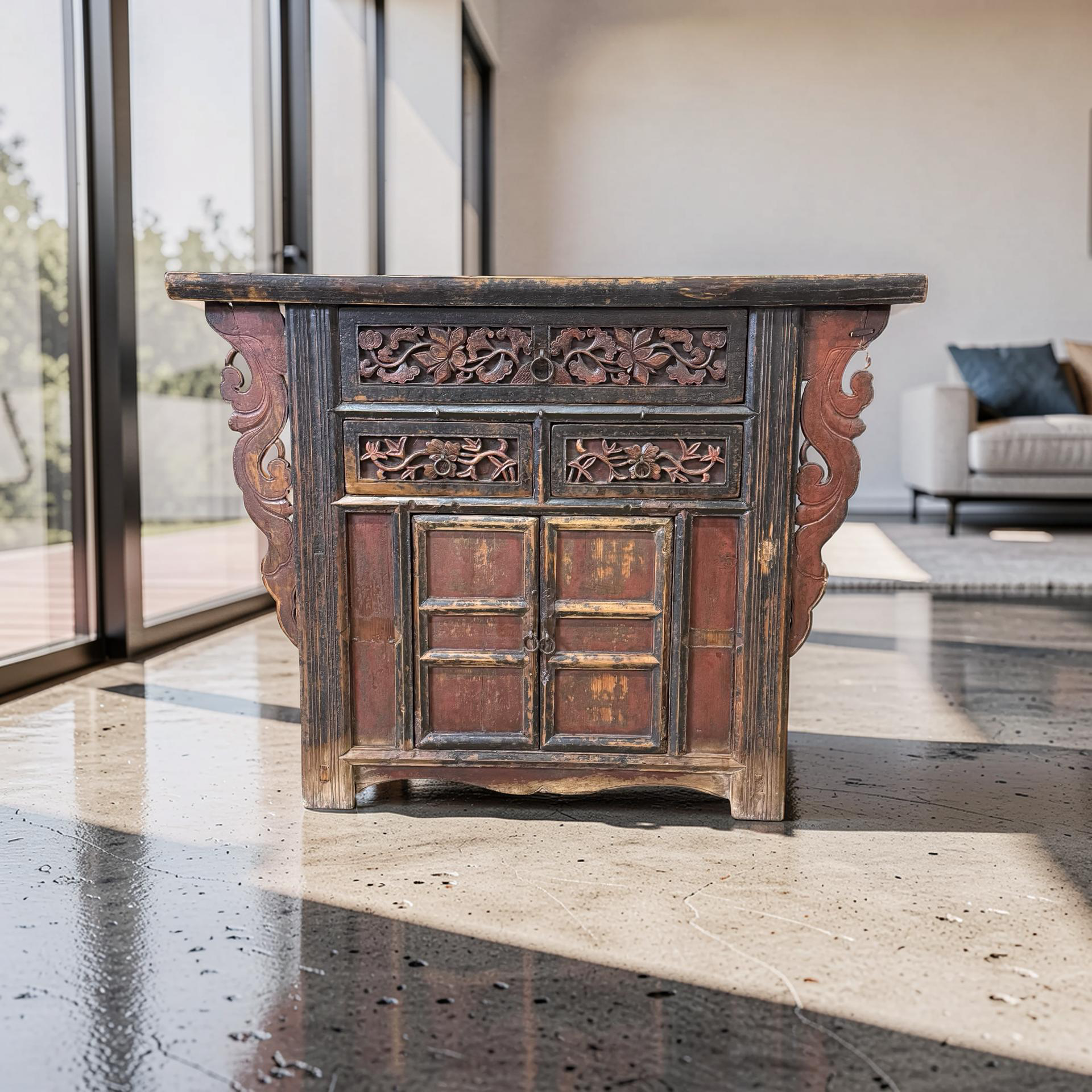 De combinatie van traditioneel snijwerk en massief hout geeft deze wandtafel een uitgesproken, maar ingetogen uitstraling. Een bijzonder stuk dat de klassieke Chinese meubelkunst op authentieke wijze tot leven brengt.
