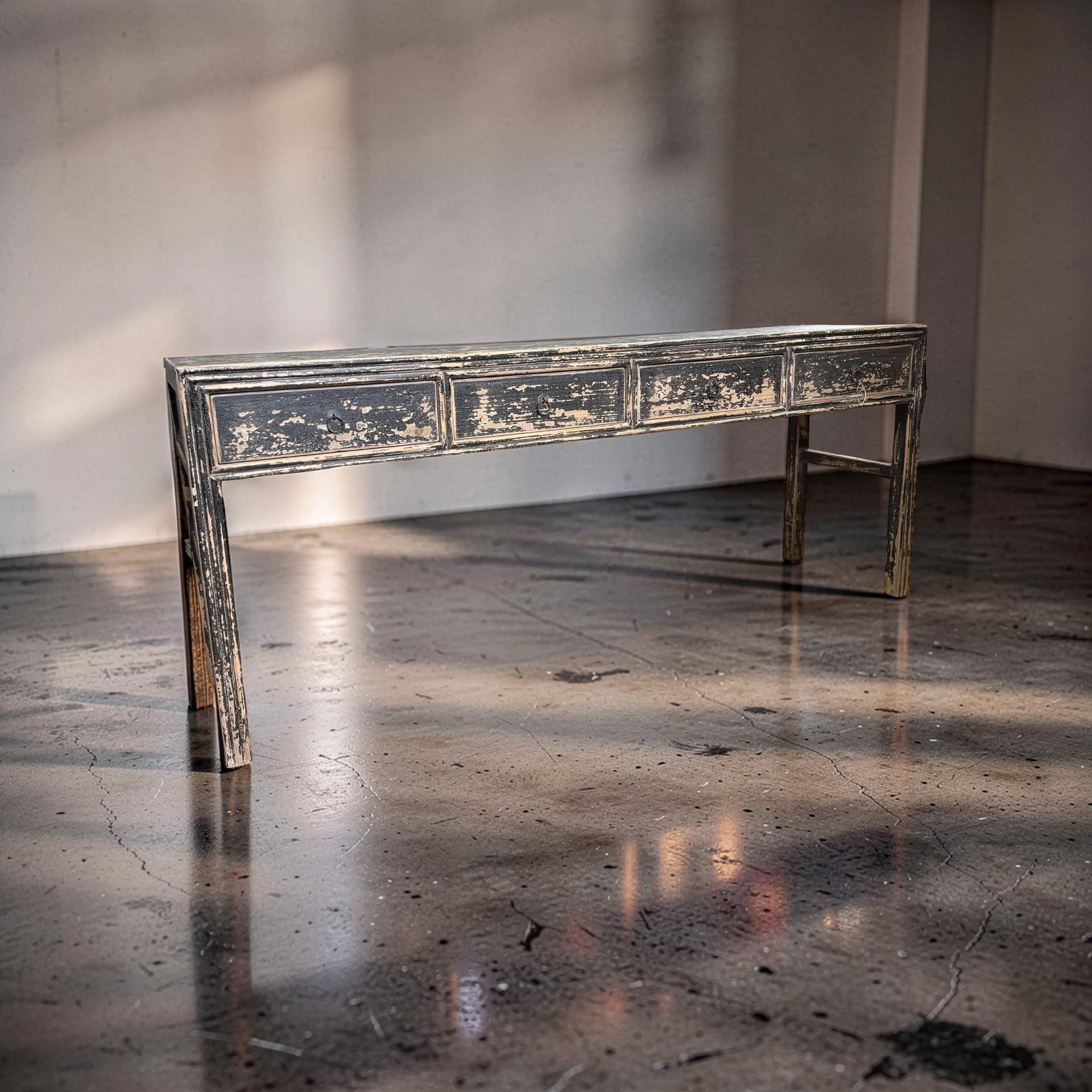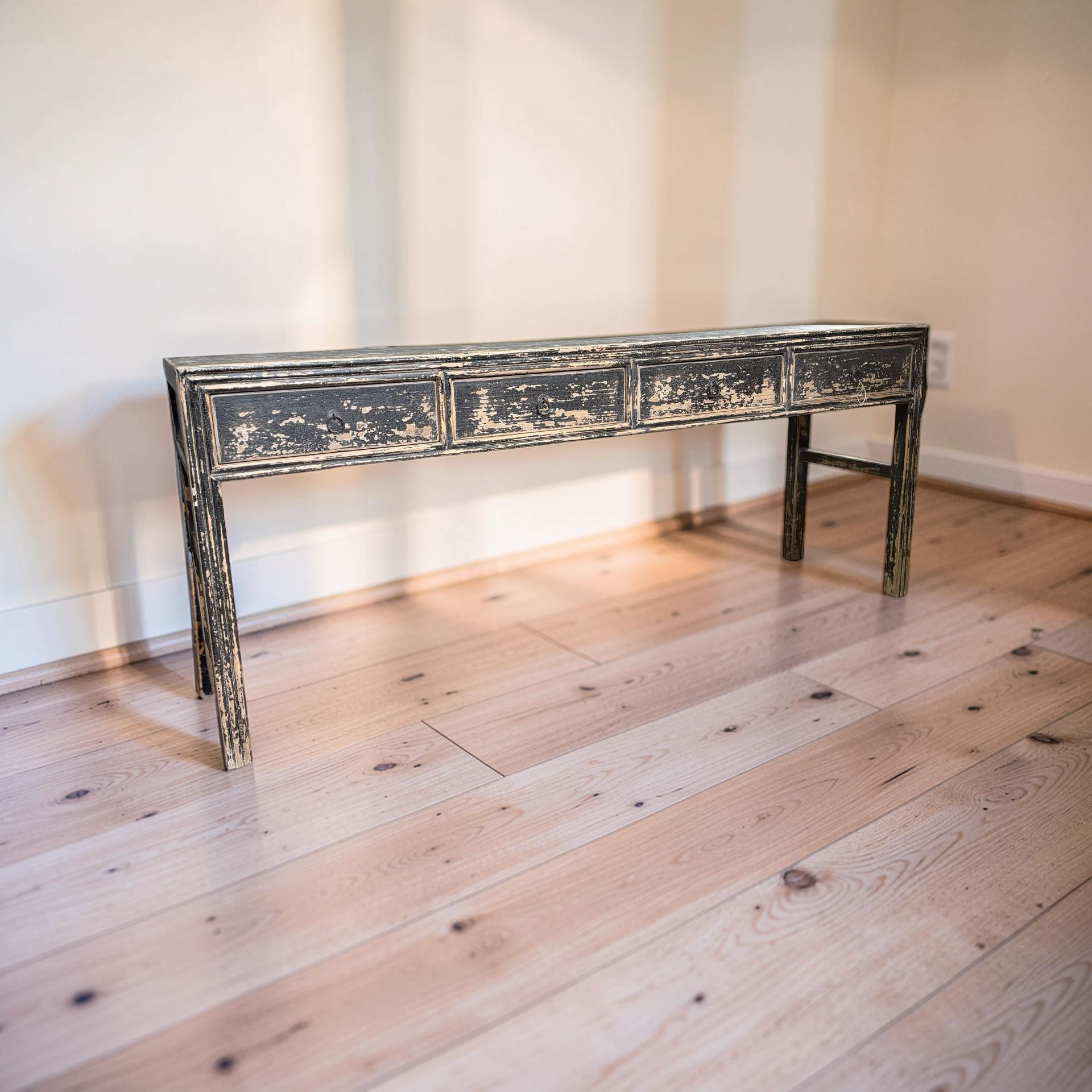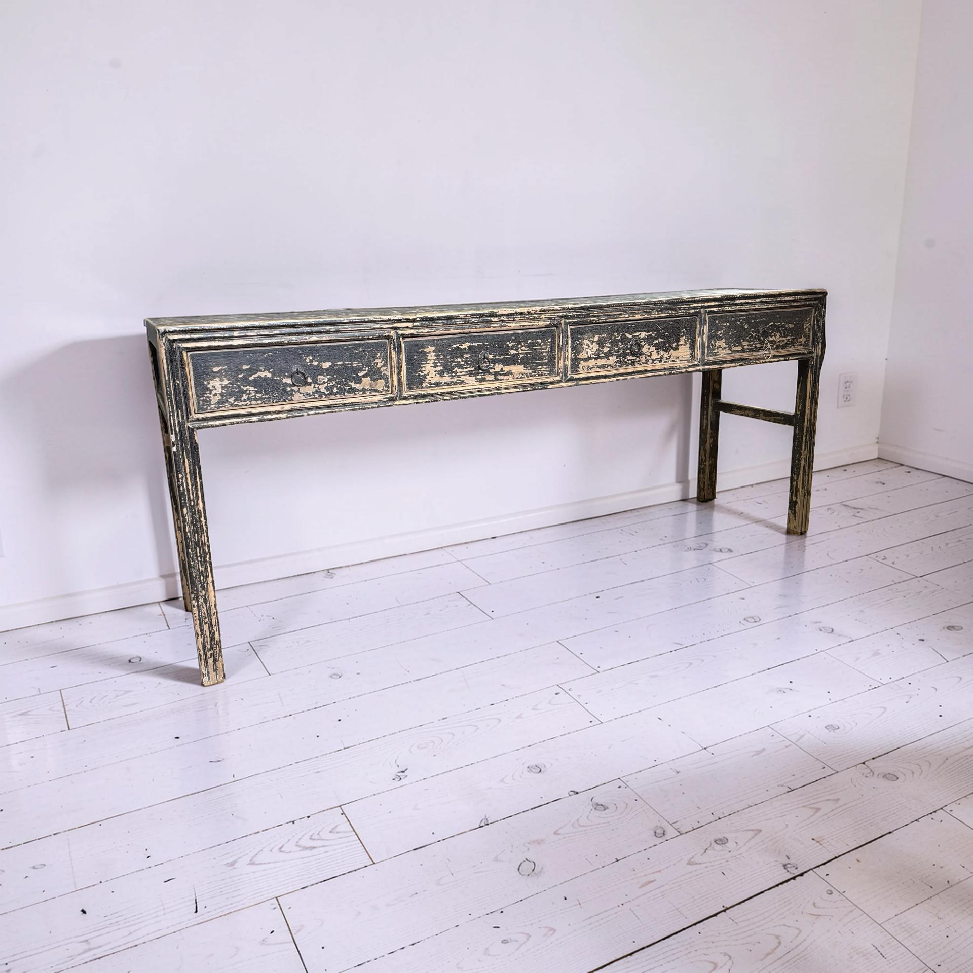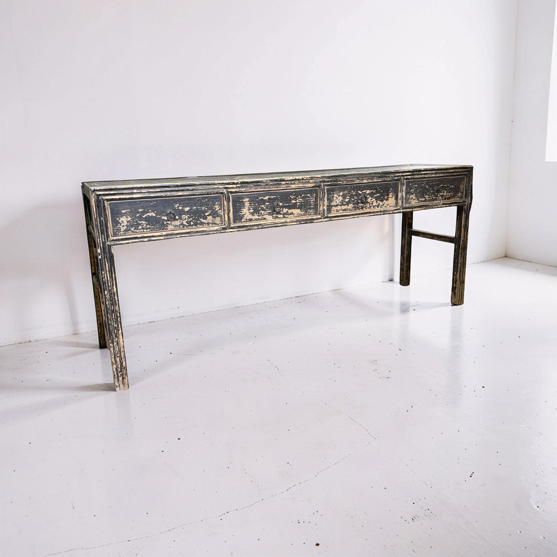 Deze unieke wandtafel uit China is handgemaakt en uitgevoerd in een diepe zwarte afwerking. De vier lades geven het meubel een praktisch karakter, terwijl het strakke ontwerp zorgt voor een rustige en tijdloze uitstraling.