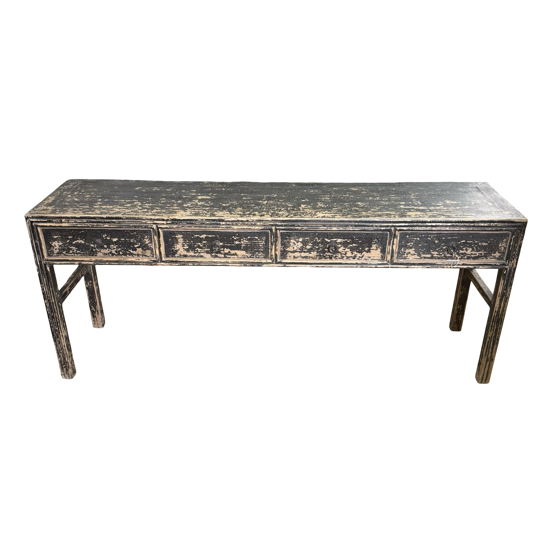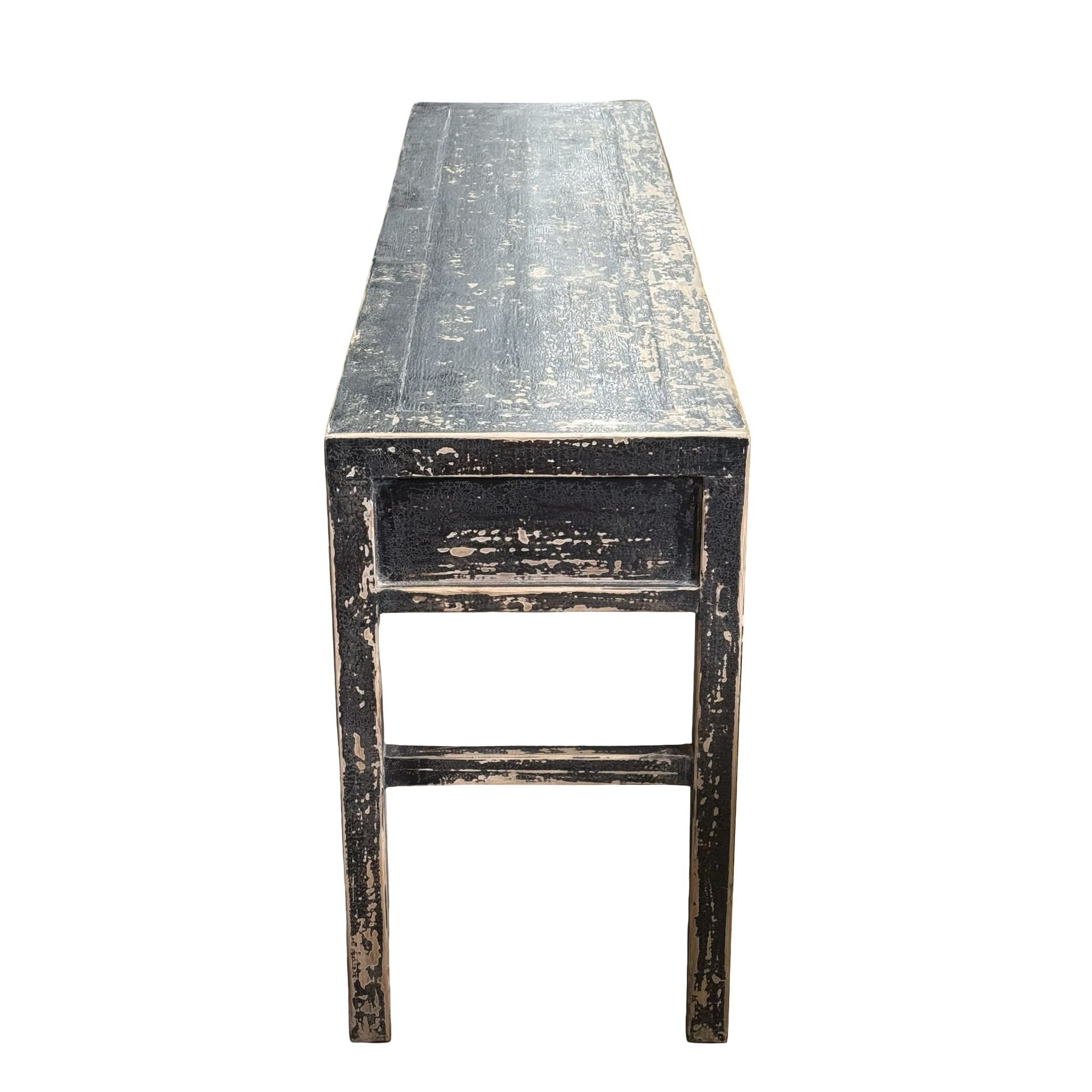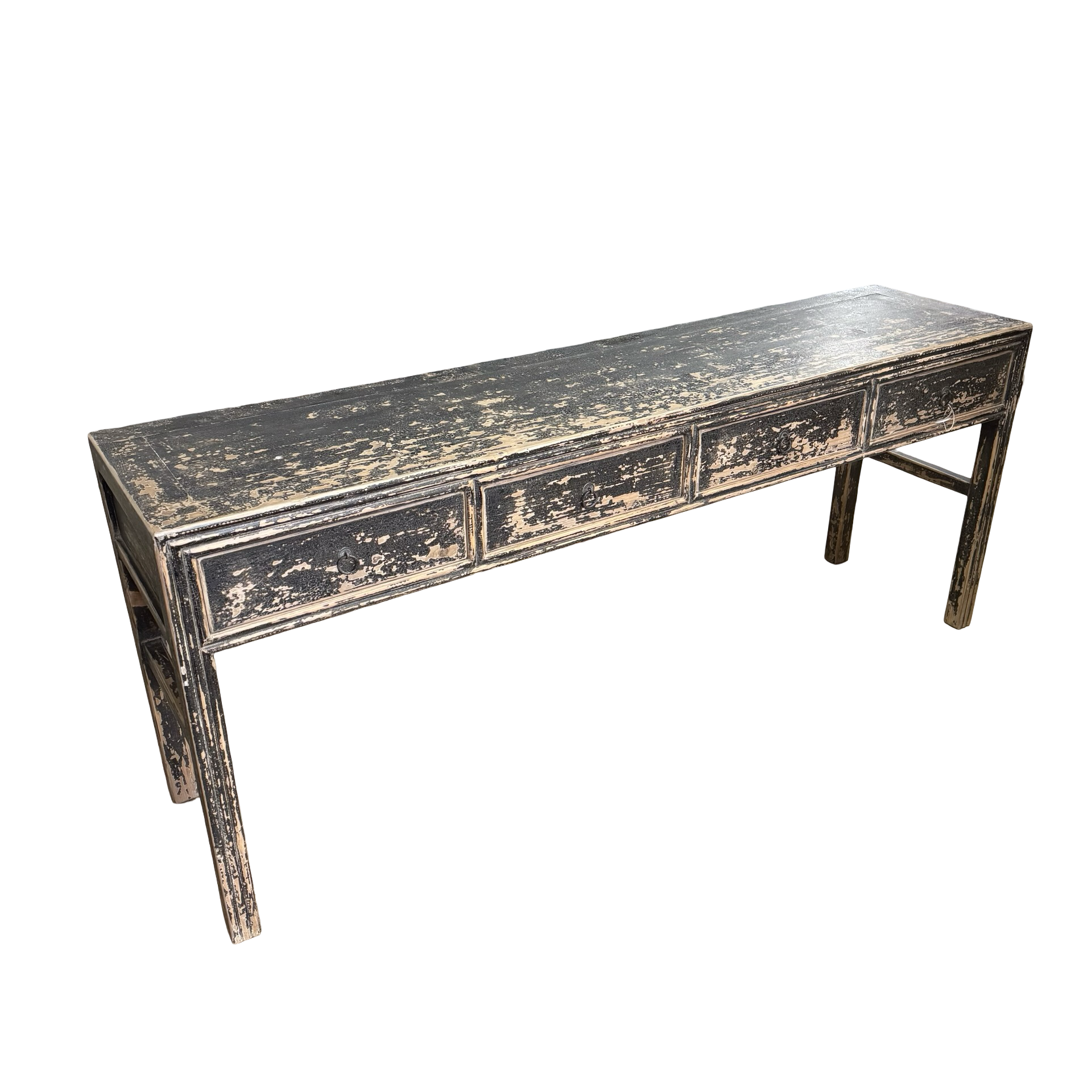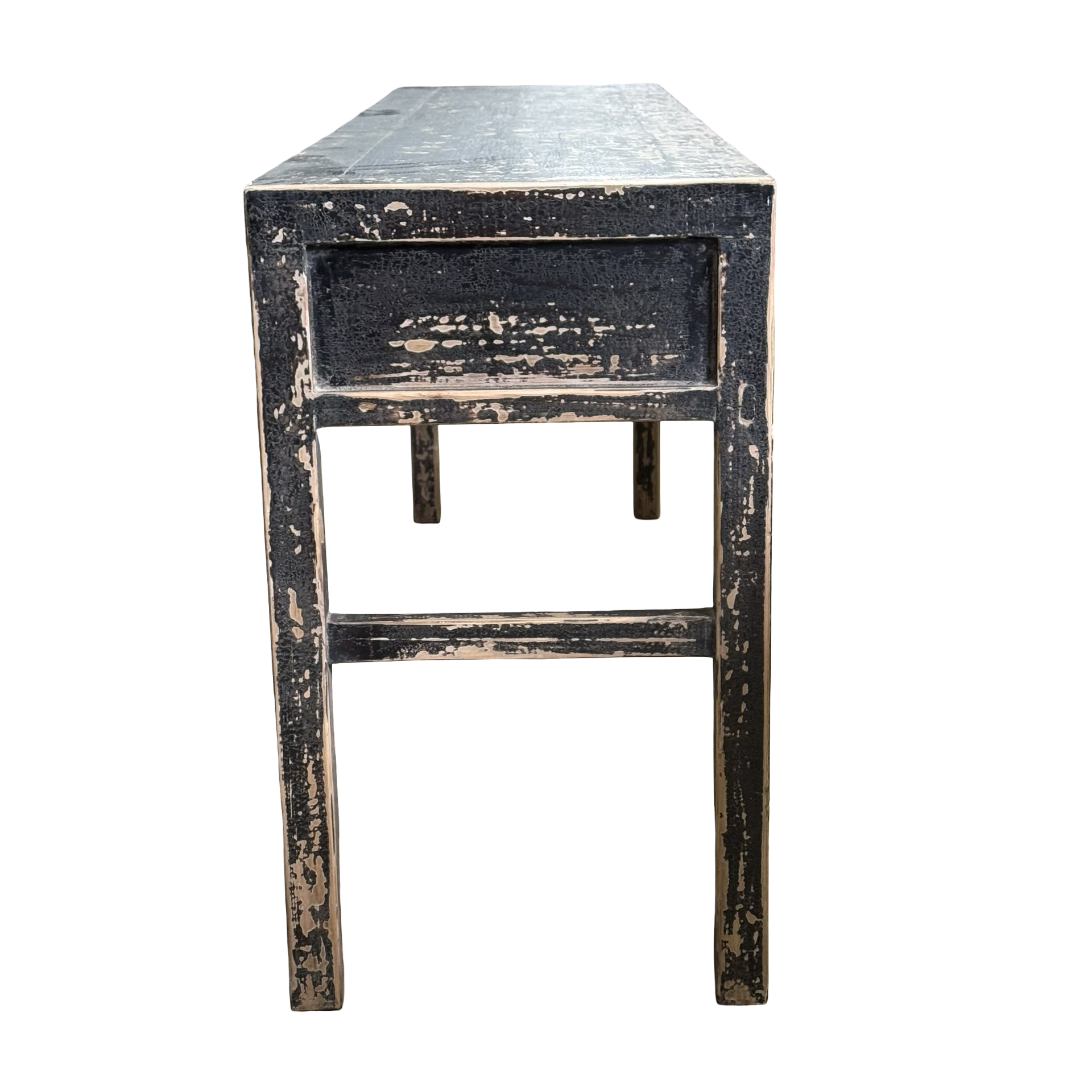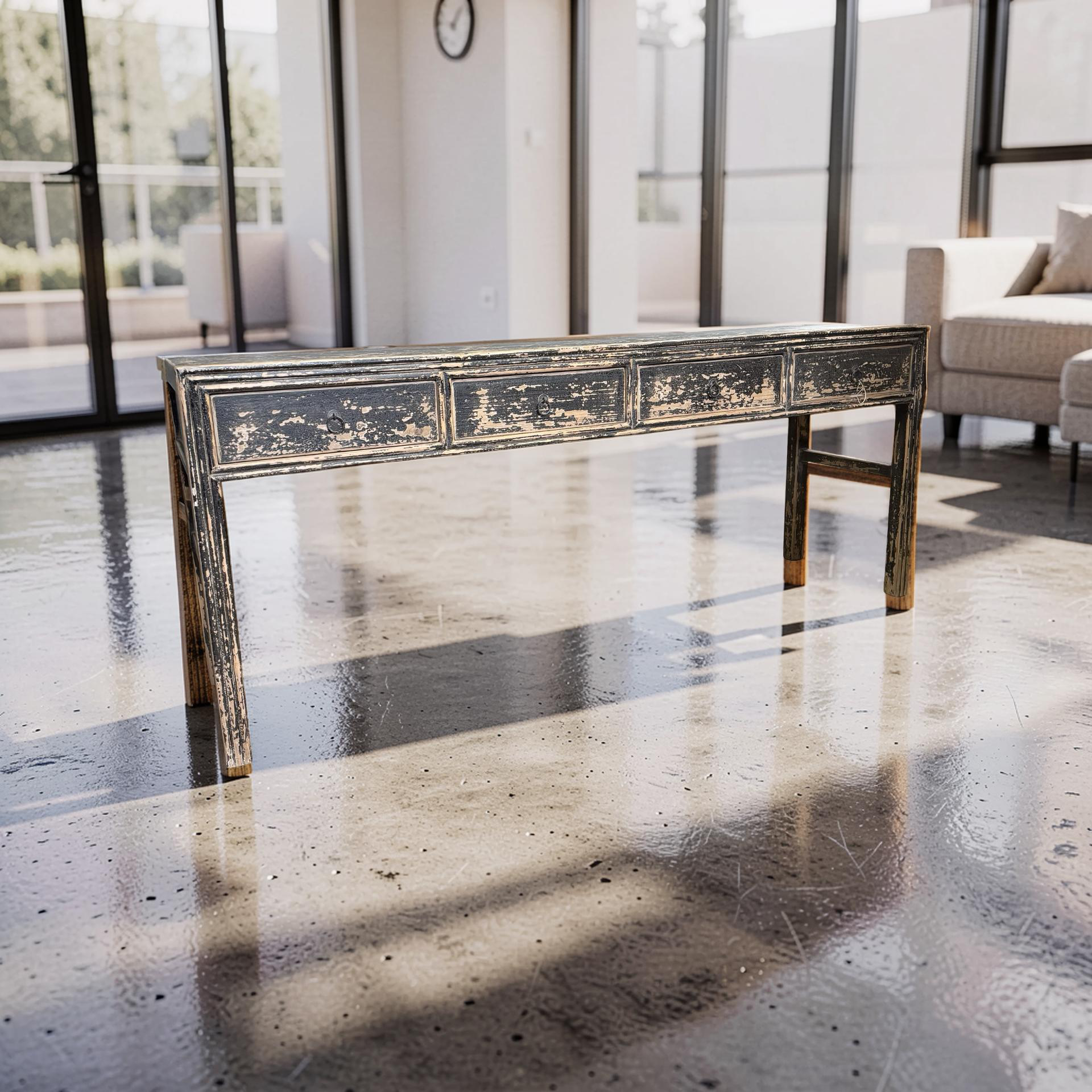 Deze unieke wandtafel uit China is handgemaakt en uitgevoerd in een diepe zwarte afwerking. De vier lades geven het meubel een praktisch karakter, terwijl het strakke ontwerp zorgt voor een rustige en tijdloze uitstraling.