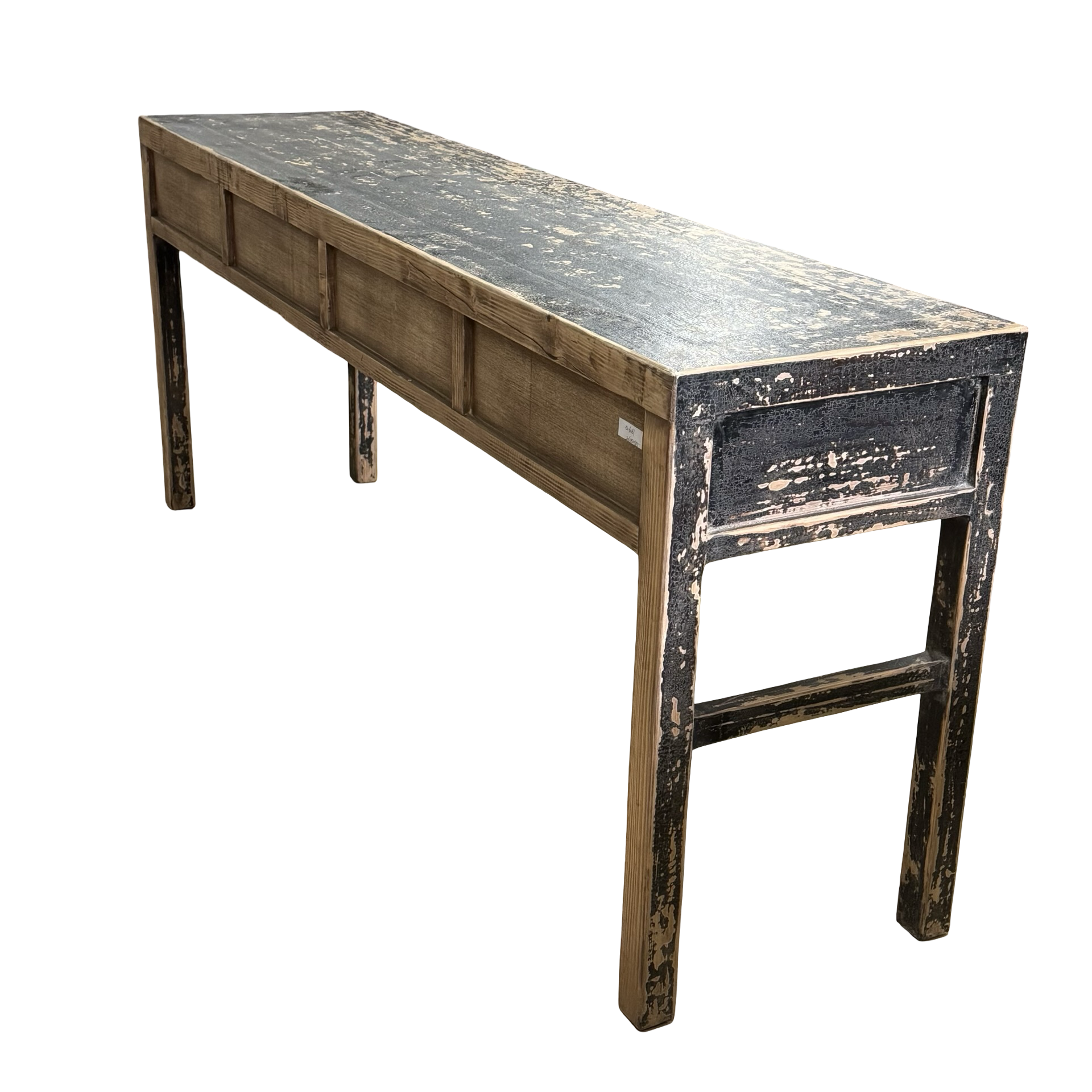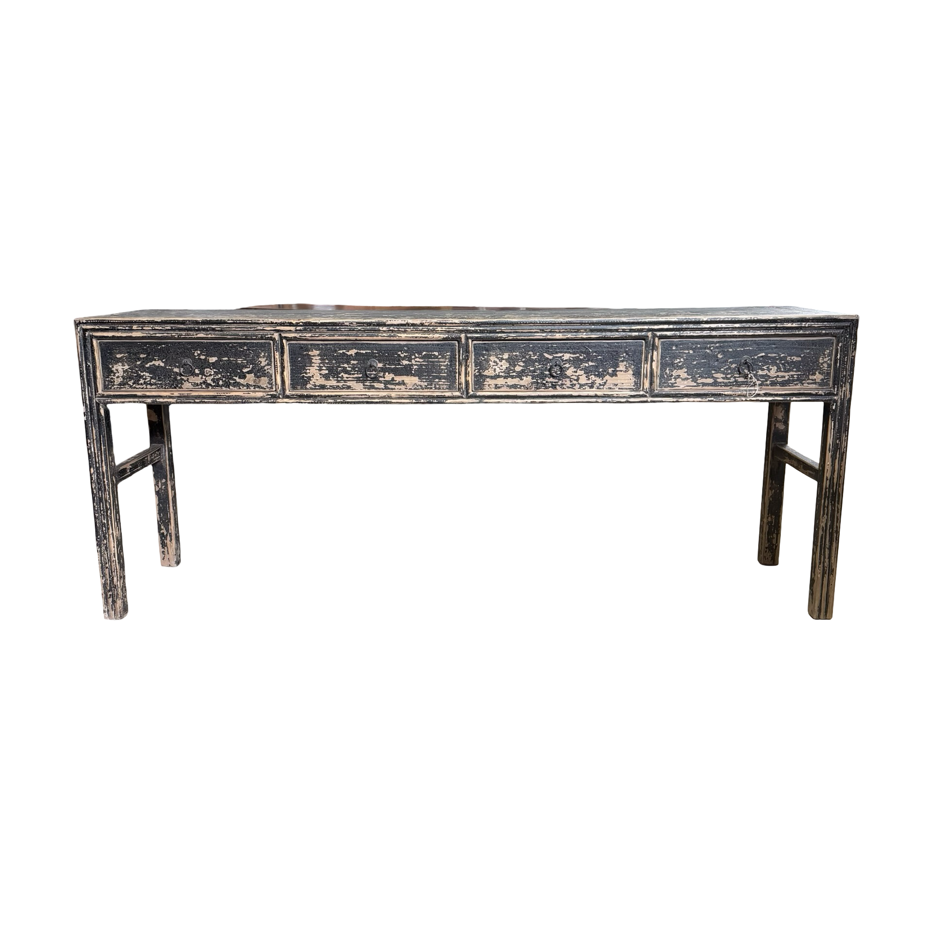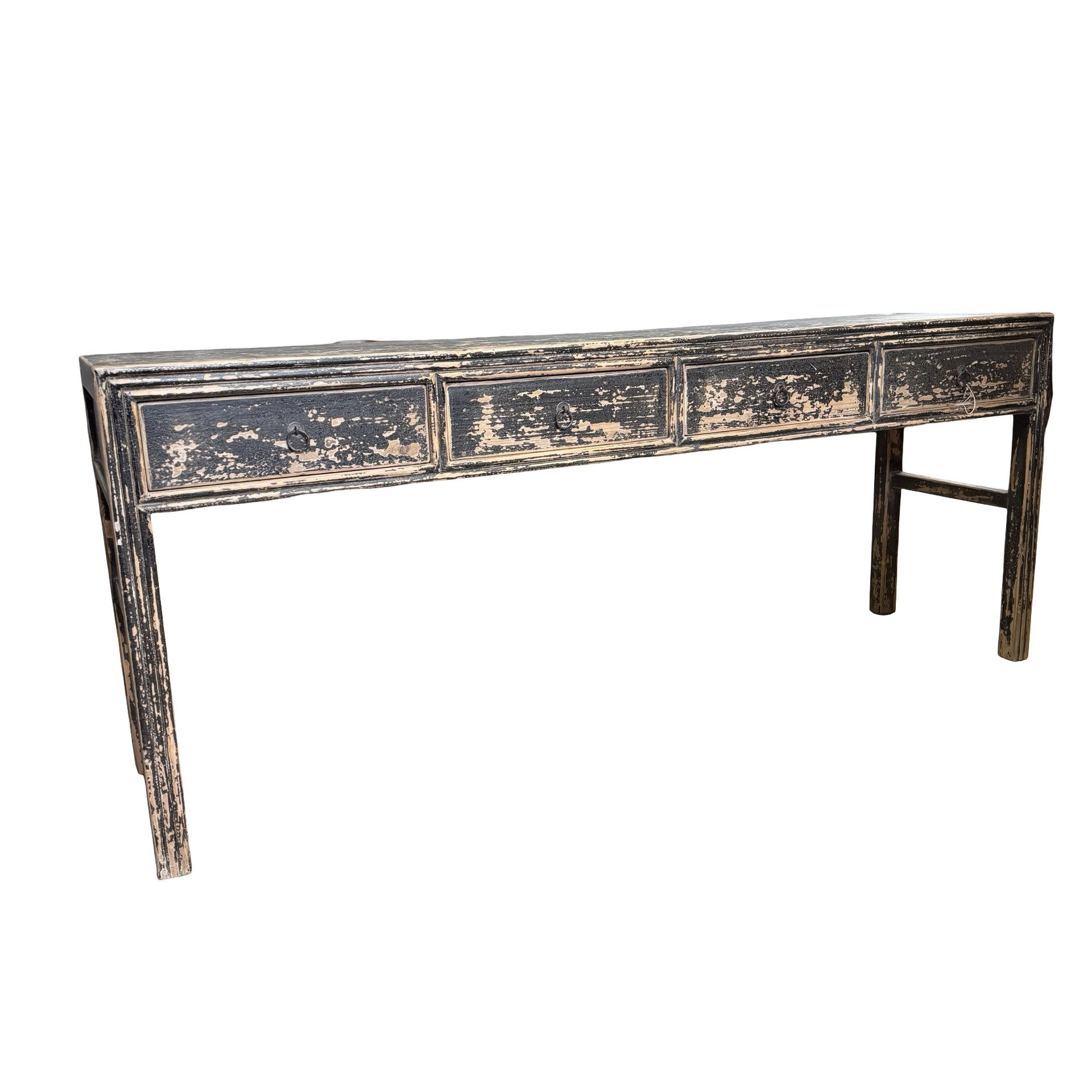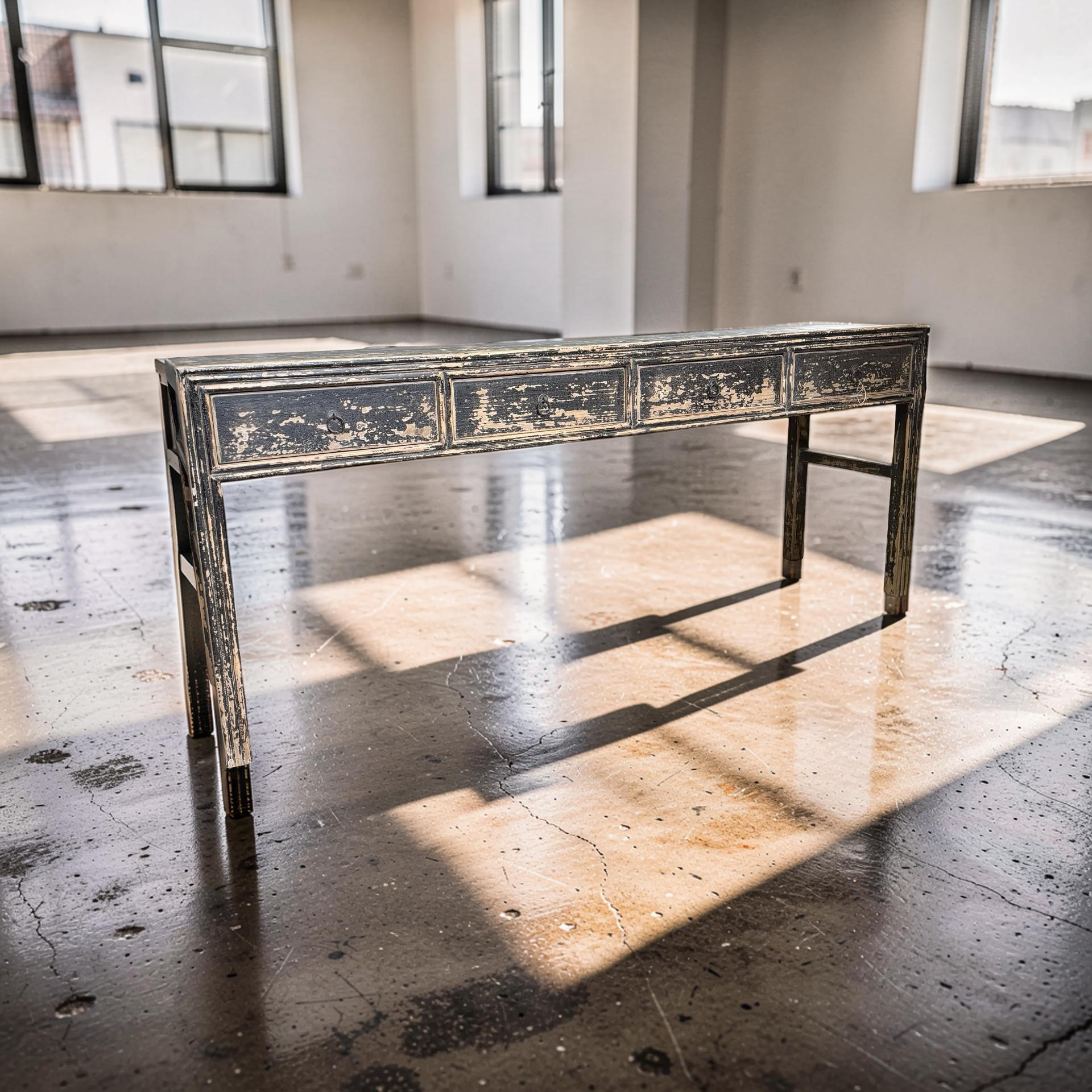 Deze unieke wandtafel uit China is handgemaakt en uitgevoerd in een diepe zwarte afwerking. De vier lades geven het meubel een praktisch karakter, terwijl het strakke ontwerp zorgt voor een rustige en tijdloze uitstraling.